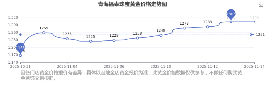 今日2025年11月16日,青海福泰珠寶黃金價(jià)格為1303.0元/克。