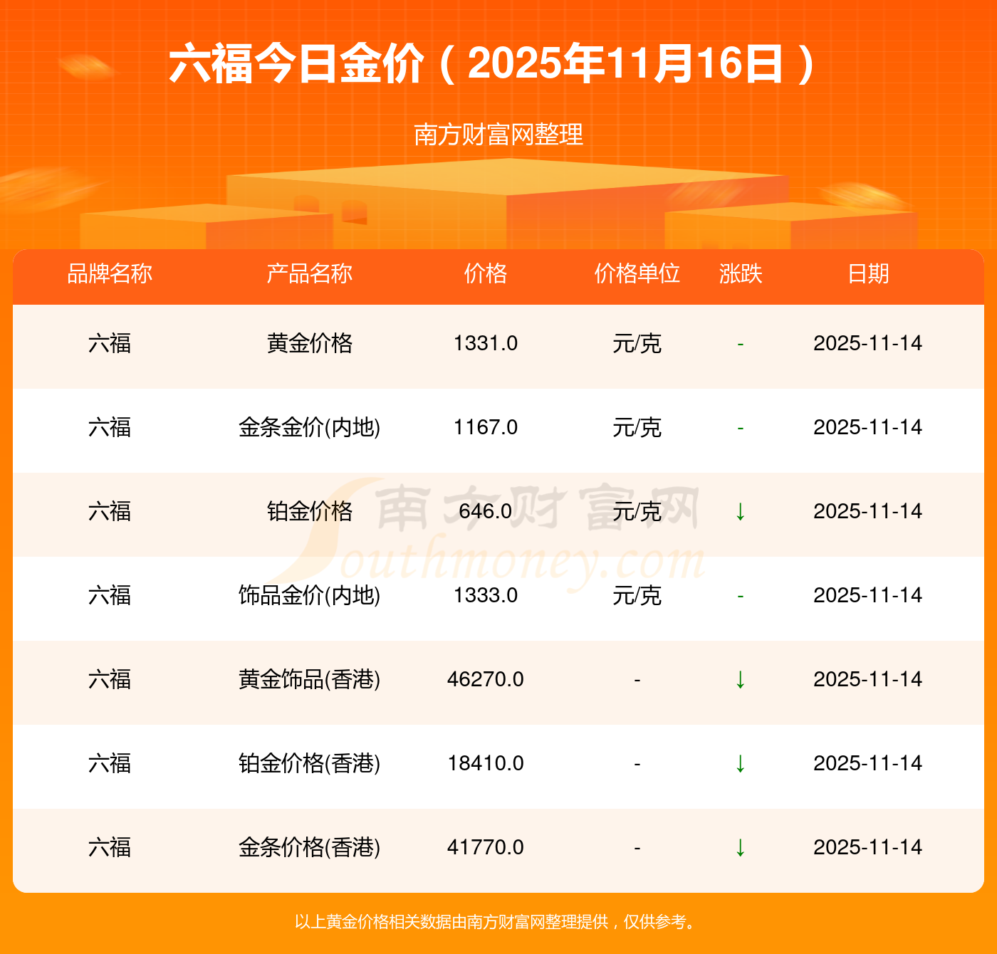 2025年11月16日六福最新價格:黃金價格1333.0元/克,鉑金價格646.0元/克,飾品金價(內(nèi)地)1333.0元/克,黃金飾品(香港)46320.0,鉑金價格(香港)18410.0,金條價格(香港)41780.0,金條金價(內(nèi)地)1167.0元/克,黃金價格1322.0元/克,鉑金價格600.0元/克,足金價格1322.0元/克,黃金價格1295.0元/克。