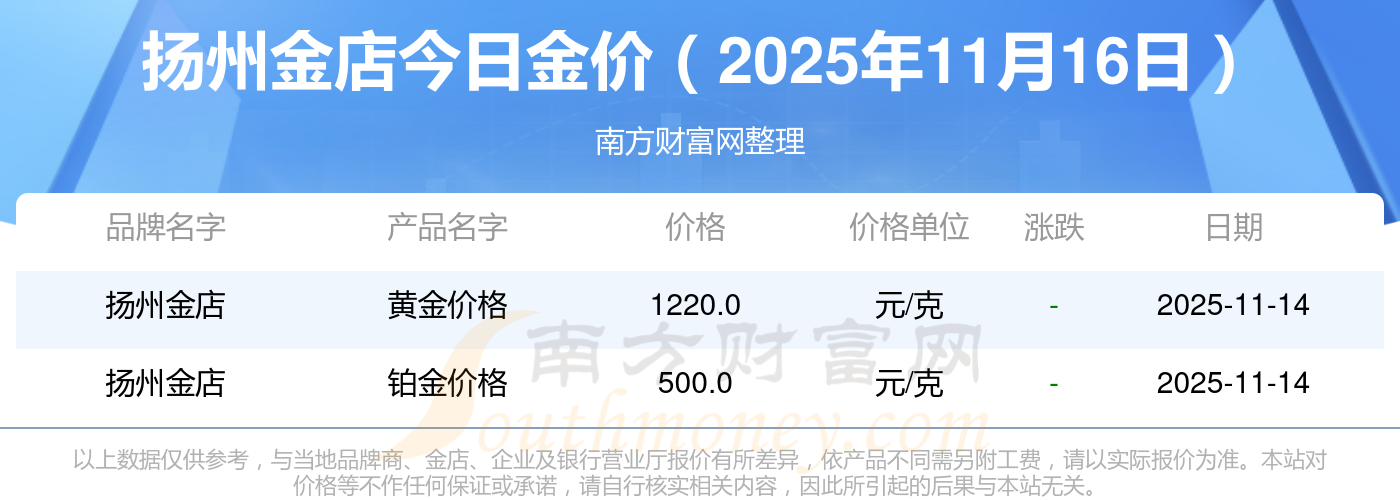 現(xiàn)在揚州金店黃金價格是多少錢1克_2025年揚州金店今日金價是多少錢一克,最新?lián)P州金店查詢,2025年11月16日揚州金店鉑金價格現(xiàn)在每克多少錢?最新?lián)P州金店鉑金價格報價公布,一起來看看吧!