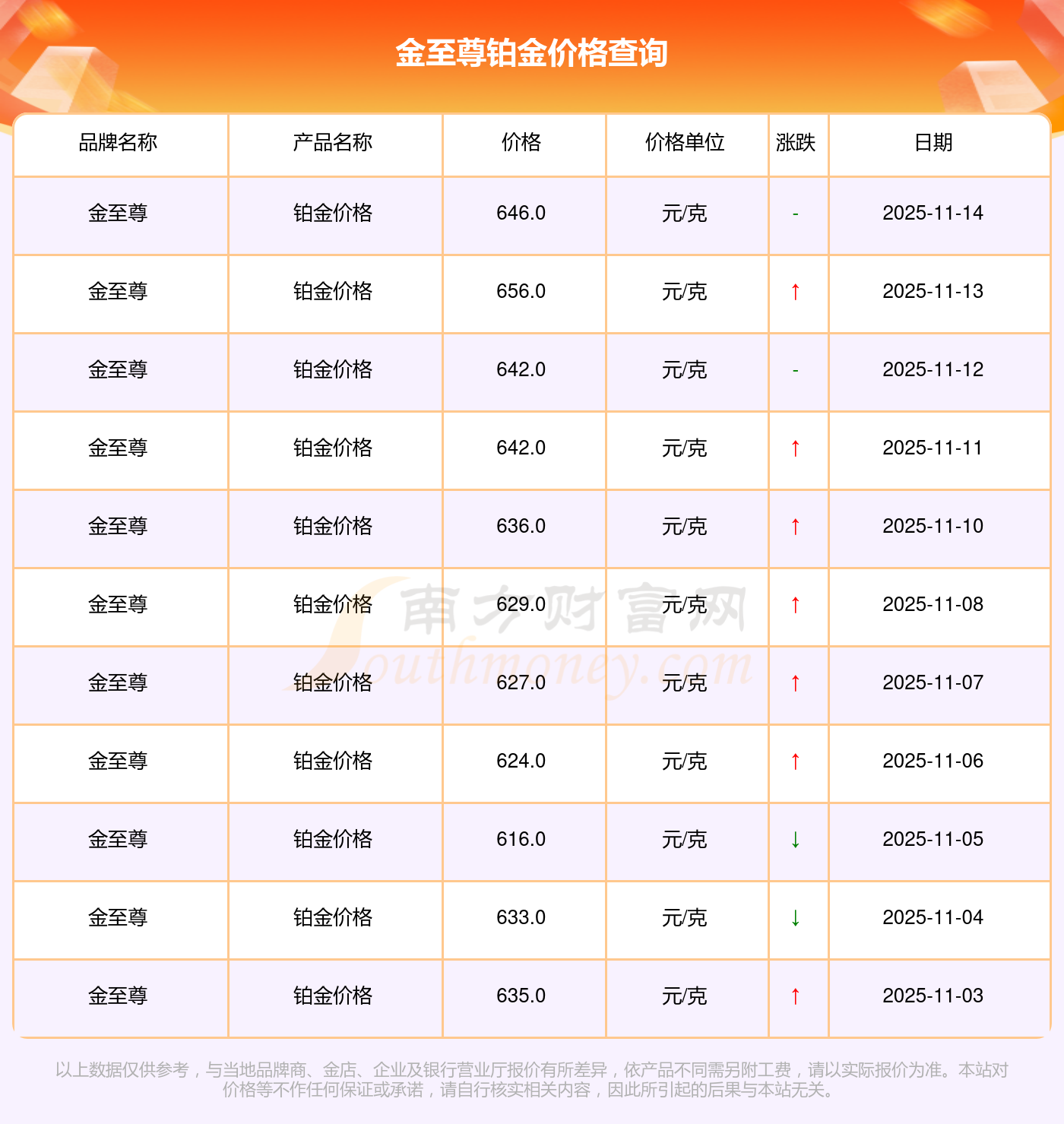 646.0元/克是金至尊在今日給出的 鉑金價格最新價格。