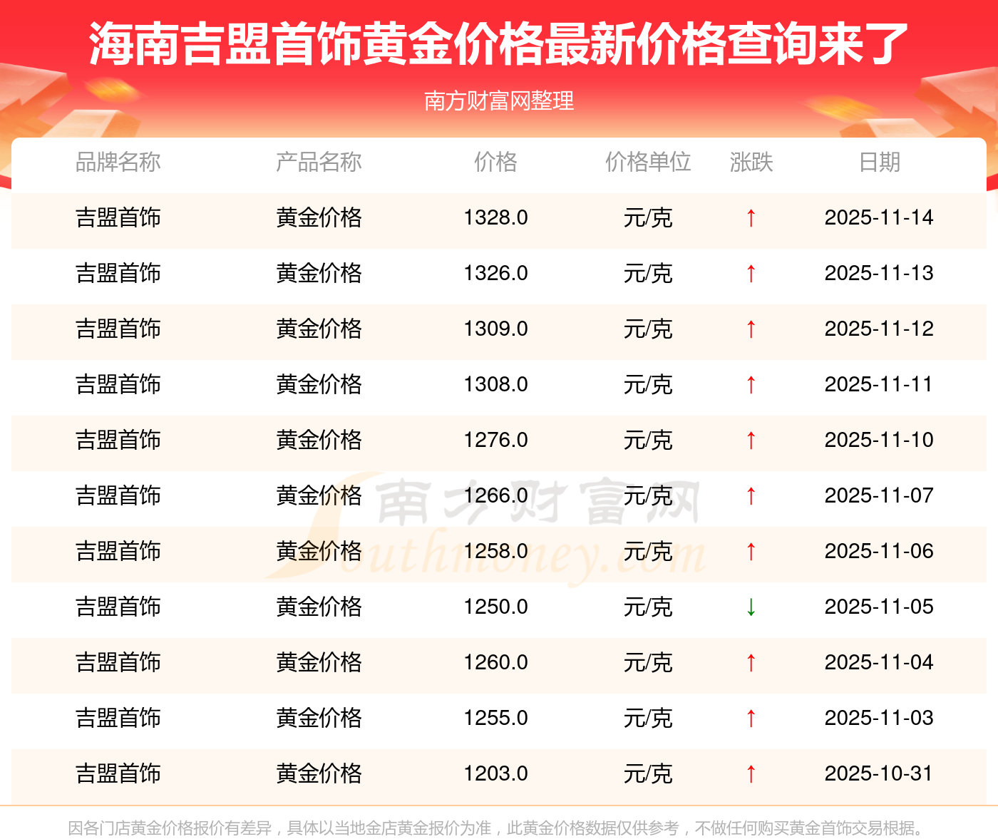 今日海南吉盟首飾黃金價格:1328.0元/克。