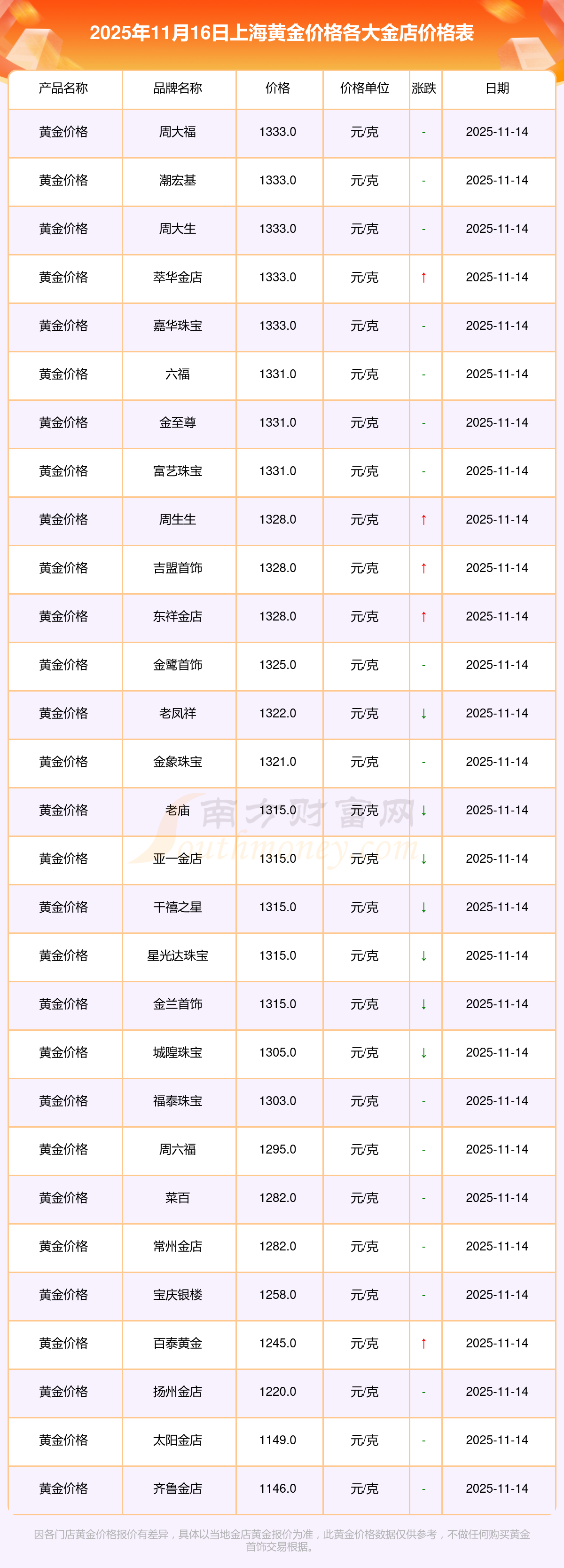 2025年11月16日上海周大福、周大福、周大福、周大福、周大福、周大福、周大福、老鳳祥、老鳳祥、老鳳祥、周六福等各大金店品牌黃金價格最新價格行情來了,如下:周大福黃金價格1333.0元/克,周大福鉑金價格646.0元/克,周大福飾品金價(內(nèi)地)1333.0元/克,周大福黃金飾品(香港)46320.0,周大福鉑金價格(香港)18410.0,周大福金條價格(香港)41780.0,周大福金條金價(內(nèi)地)1167.0元/克,老鳳祥黃金價格1322.0元/克,老鳳祥鉑金價格600.0元/克,老鳳祥足金價格1322.0元/克,周六福黃金價格1295.0元/克。