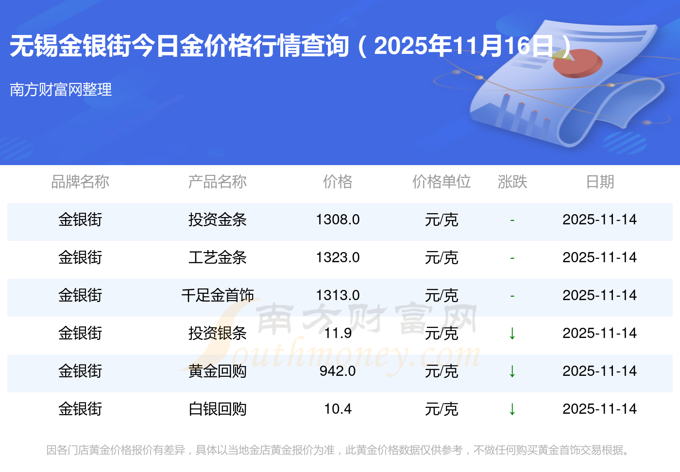以上數(shù)據(jù)僅供參考,與當(dāng)?shù)仄放粕、金店、企業(yè)及銀行營業(yè)廳報價有所差異,依產(chǎn)品不同需另附工費,請以實際報價為準(zhǔn)。本站對價格等不作任何保證或承諾,請自行核實相關(guān)內(nèi)容,因此所引起的后果與本站無關(guān)。