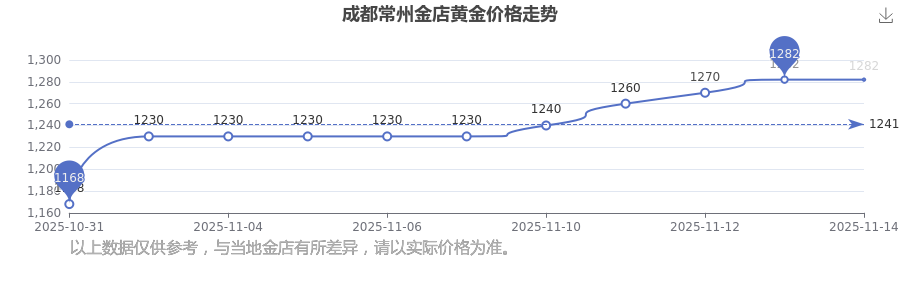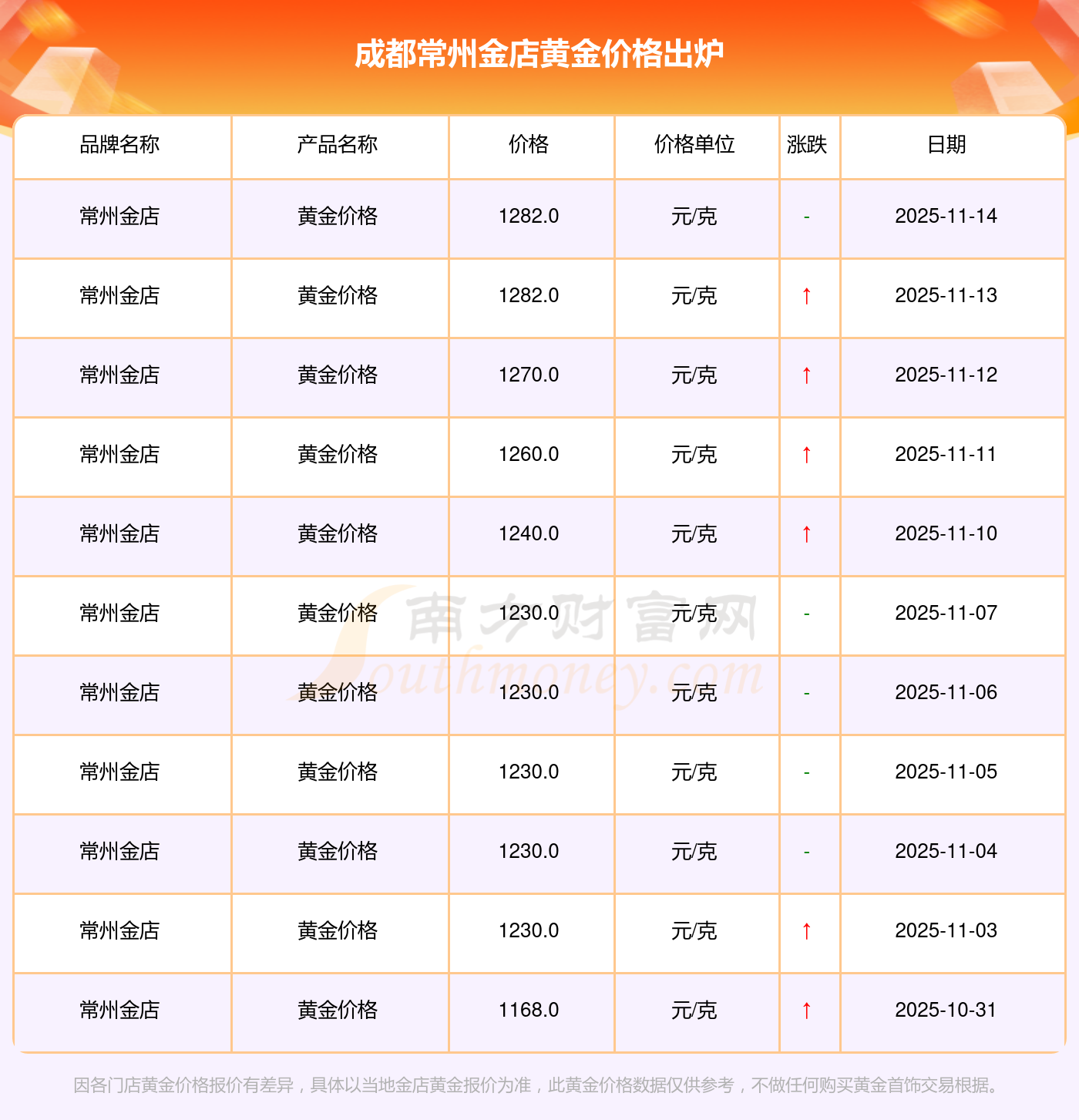 今日2025年11月16日,成都常州金店黃金價格為1282.0元/克。