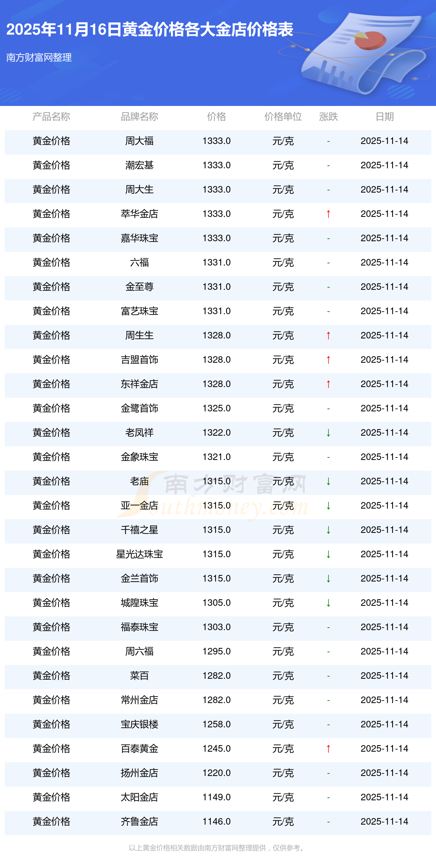 2025年11月16日周大福、周大福、周大福、周大福、周大福、周大福、周大福、老鳳祥、老鳳祥、老鳳祥、周六福等各大金店品牌黃金價格最新價格如下:周大福黃金價格1333.0元/克,周大福鉑金價格646.0元/克,周大福飾品金價(內(nèi)地)1333.0元/克,周大福黃金飾品(香港)46320.0,周大福鉑金價格(香港)18410.0,周大福金條價格(香港)41780.0,周大福金條金價(內(nèi)地)1167.0元/克,老鳳祥黃金價格1322.0元/克,老鳳祥鉑金價格600.0元/克,老鳳祥足金價格1322.0元/克,周六福黃金價格1295.0元/克。