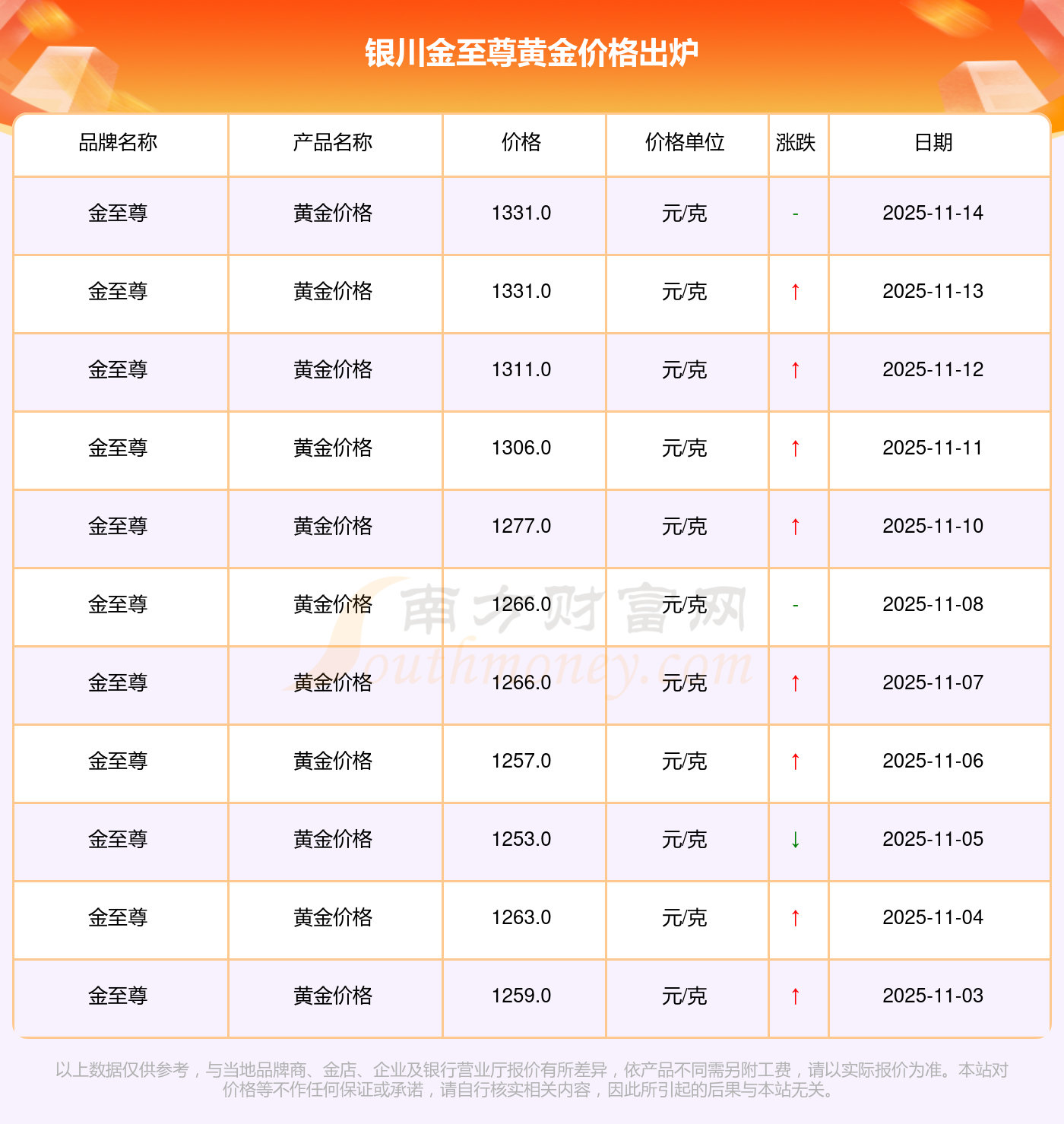 今日銀川金至尊黃金價(jià)格公布黃金一克的價(jià)格為幾何今日(2025年11月16日)銀川金至尊黃金價(jià)格為1331.0元/克。