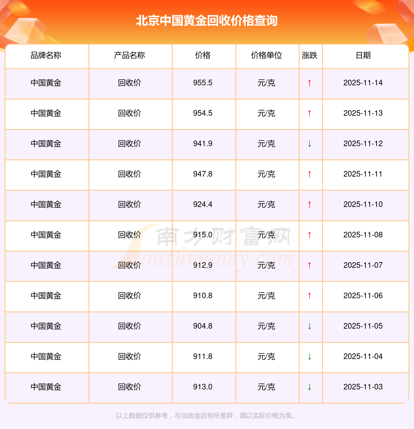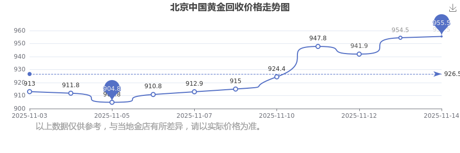 今日2025年11月16日,北京中國黃金回收價格為955.5元/克。