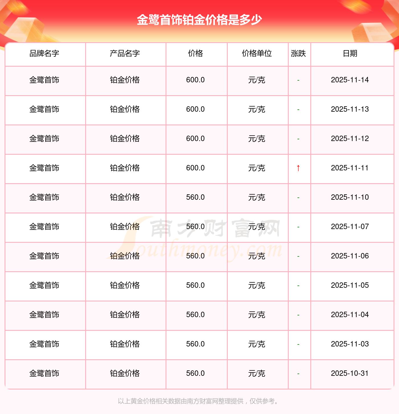 今日(2025年11月16日)金鷺首飾鉑金價格:600.0元/克。