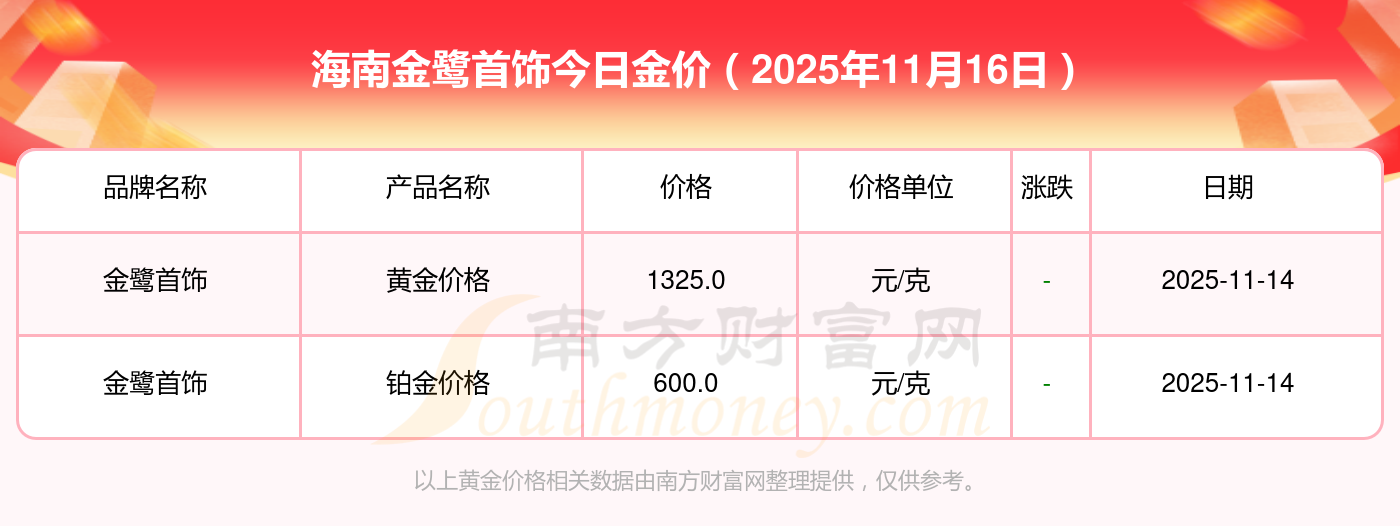 今天黃金價(jià)格多少一克_2025年11月16日海南金鷺首飾黃金今日最新價(jià)格表公布,隨小編來(lái)了解一下詳情。