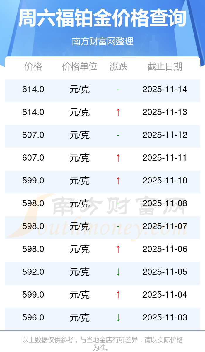 今日周六福鉑金價(jià)格最新是614.0元/克。