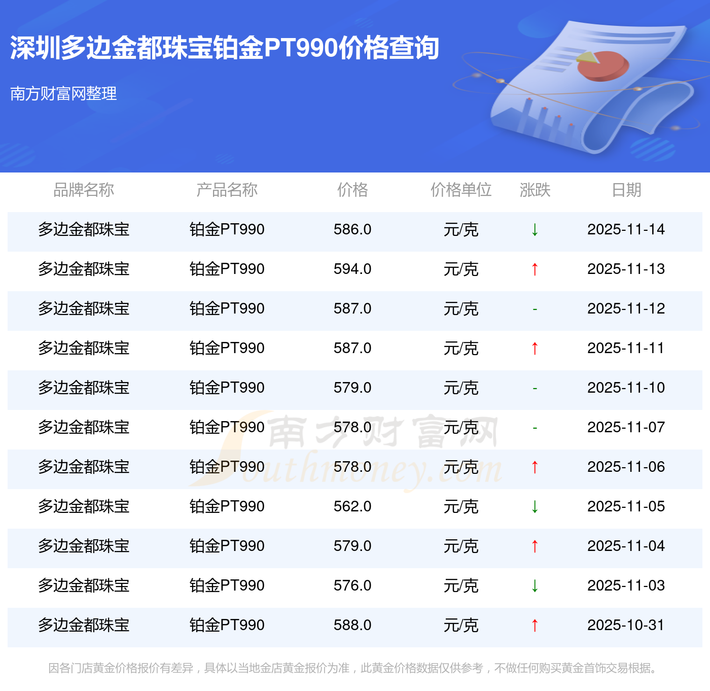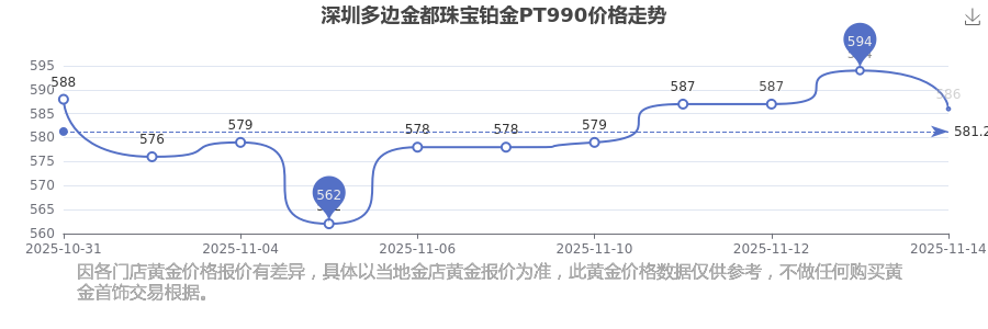 今日深圳多邊金都珠寶鉑金PT990價格為586.0元/克。