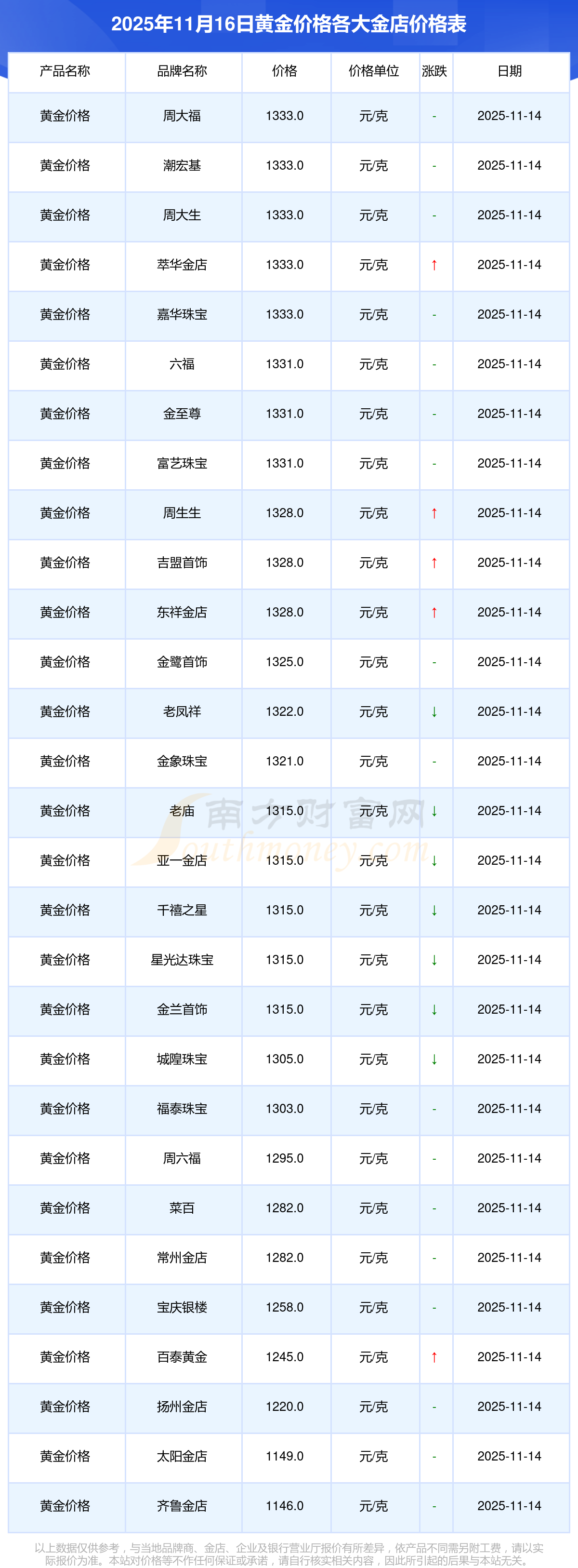 2025年11月16日,周大福、周大福、周大福、周大福、周大福、周大福、周大福、老鳳祥、老鳳祥、老鳳祥、周六福等各大金店品牌黃金價格今日價格如下:周大福1333.0元/克、周大福646.0元/克、周大福1333.0元/克、周大福46320.0、周大福18410.0、周大福41780.0、周大福1167.0元/克、老鳳祥1322.0元/克、老鳳祥600.0元/克、老鳳祥1322.0元/克、周六福1295.0元/克。