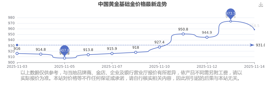 中國黃金今日基礎(chǔ)金價的最新標(biāo)價為958.5元/克。