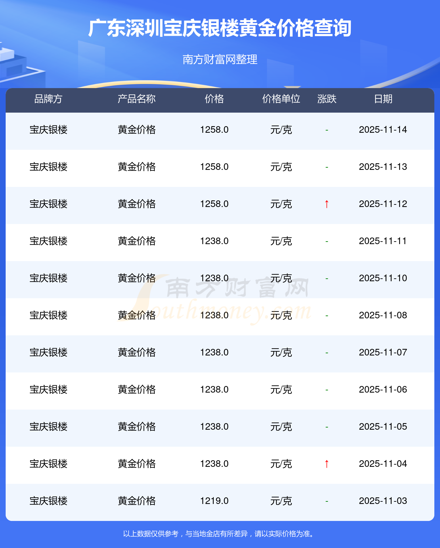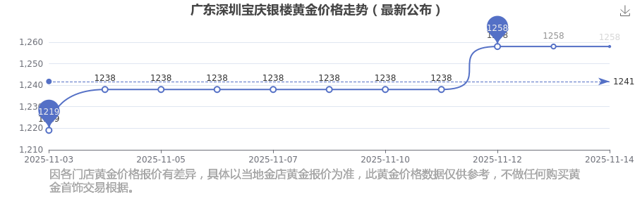 廣東深圳寶慶銀樓的黃金價格在今日(2025年11月16日),每克售價為1258.0元/克。