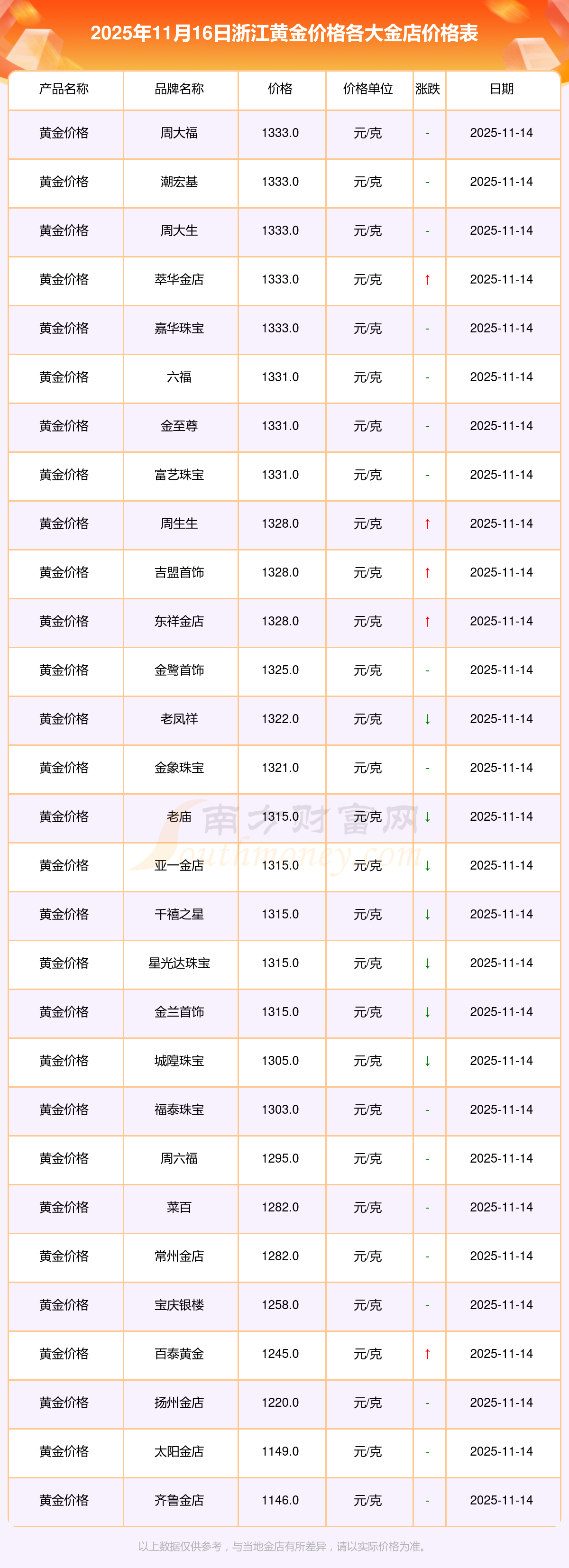 一、2025年11月16日浙江周大福、周大福、周大福、周大福、周大福、周大福、周大福、老鳳祥、老鳳祥、老鳳祥、周六福等各大金店品牌黃金價(jià)格最新價(jià)格如下:周大福黃金價(jià)格1333.0元/克,周大福鉑金價(jià)格646.0元/克,周大福飾品金價(jià)(內(nèi)地)1333.0元/克,周大福黃金飾品(香港)46320.0,周大福鉑金價(jià)格(香港)18410.0,周大福金條價(jià)格(香港)41780.0,周大福金條金價(jià)(內(nèi)地)1167.0元/克,老鳳祥黃金價(jià)格1322.0元/克,老鳳祥鉑金價(jià)格600.0元/克,老鳳祥足金價(jià)格1322.0元/克,周六福黃金價(jià)格1295.0元/克。