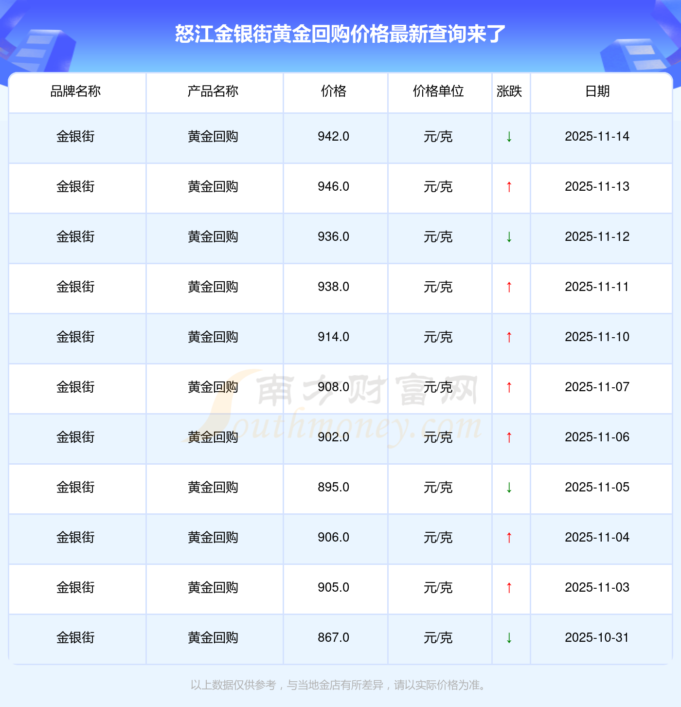 今日(2025年11月16日)怒江金銀街黃金回購最新價格為942.0元/克。