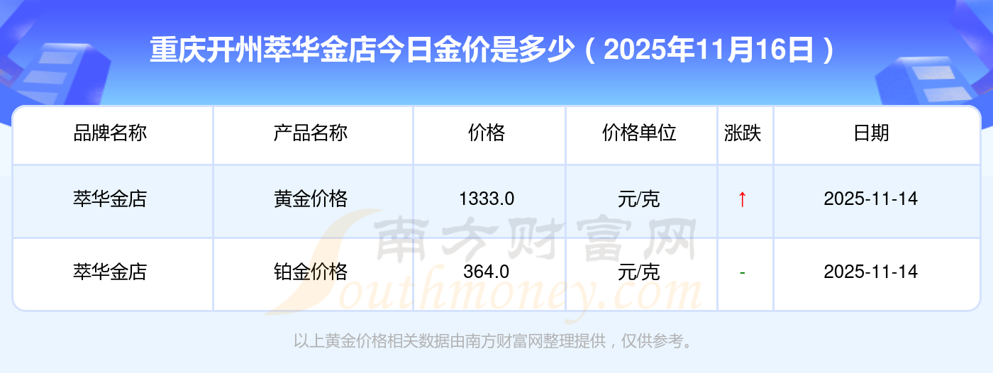 2025年11月16日重慶開州萃華金店現(xiàn)在購買一克黃金需要支付多少錢?黃金價(jià)格1333.0元/克,鉑金價(jià)格646.0元/克,飾品金價(jià)(內(nèi)地)1333.0元/克,黃金飾品(香港)46320.0,鉑金價(jià)格(香港)18410.0,金條價(jià)格(香港)41780.0,金條金價(jià)(內(nèi)地)1167.0元/克,黃金價(jià)格1322.0元/克,鉑金價(jià)格600.0元/克,足金價(jià)格1322.0元/克,黃金價(jià)格1295.0元/克。