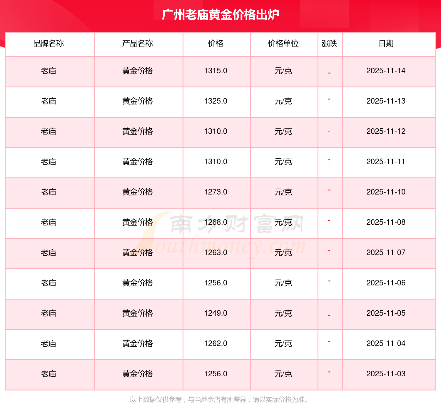 今日廣州老廟黃金價(jià)格查詢,2025年11月16日廣州老廟黃金價(jià)格是1315.0元/克。