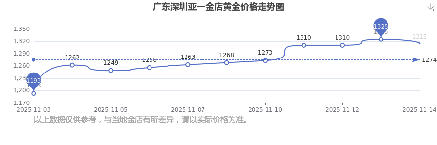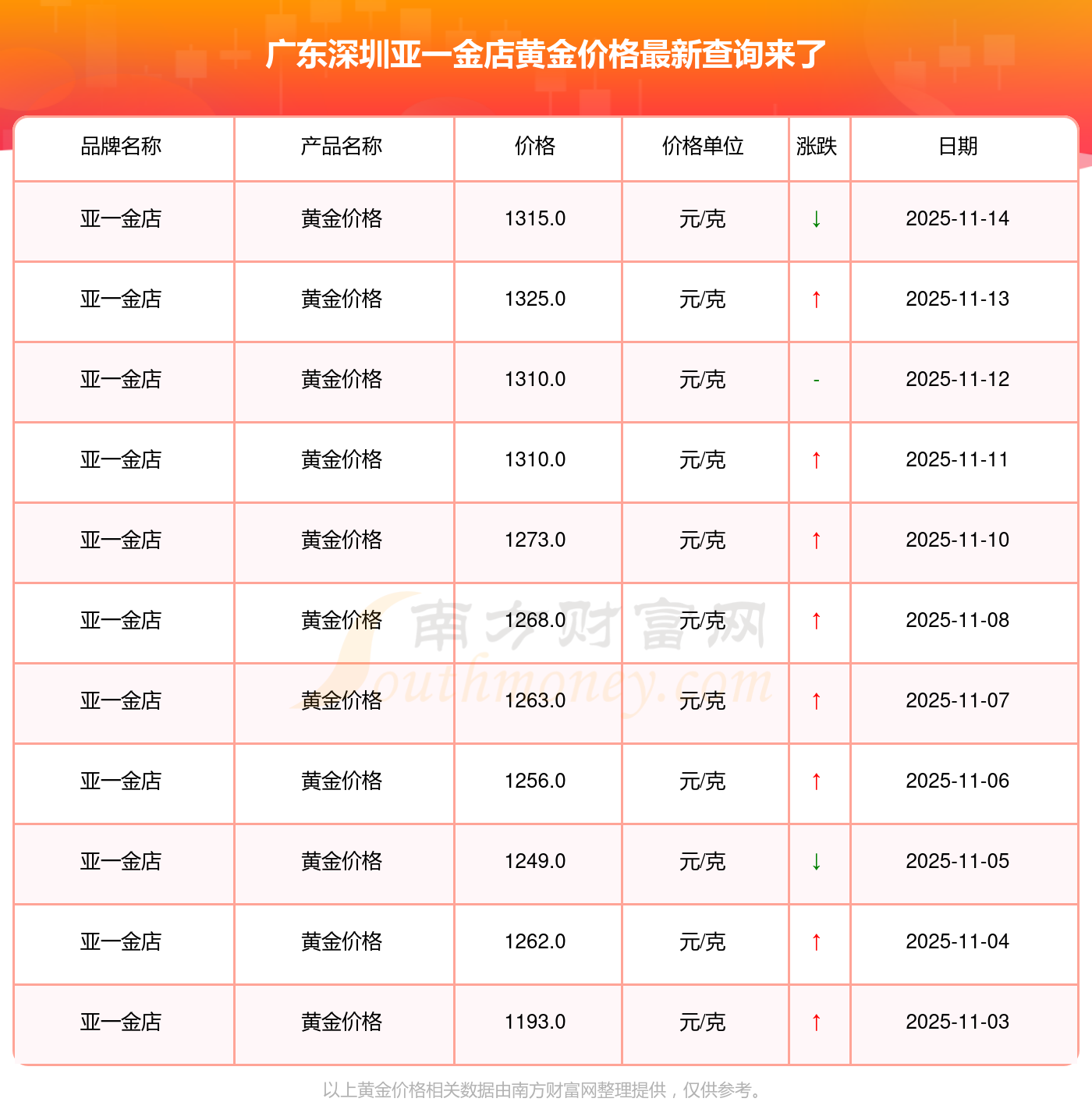 1315.0元/克的黃金價(jià)格,是廣東深圳亞一金店在 2025年11月16日給出的。