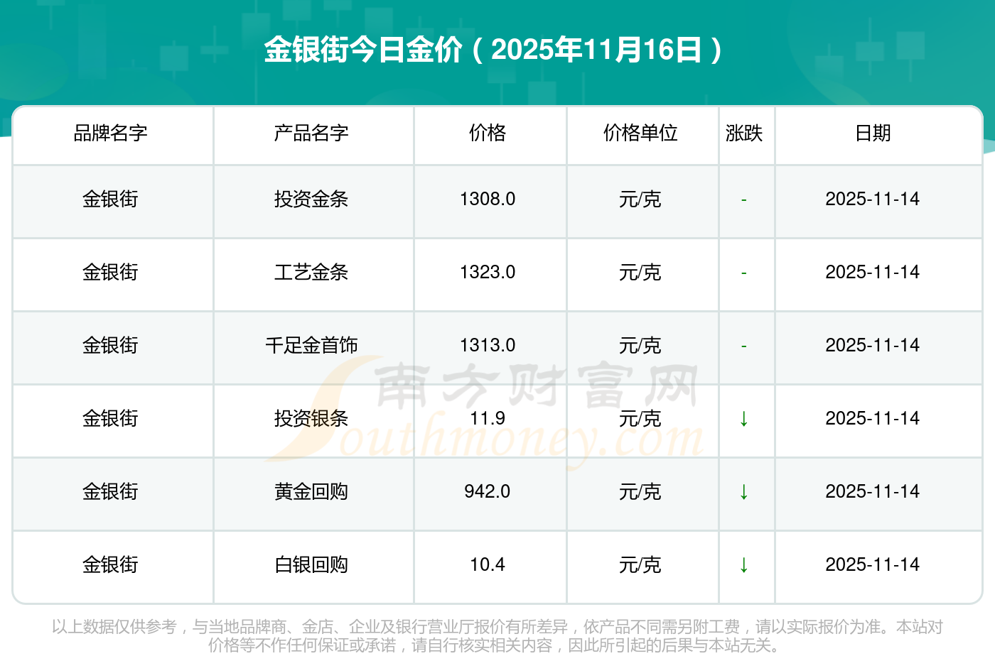 2025年11月16日金銀街最新價(jià)格:黃金價(jià)格1333.0元/克,鉑金價(jià)格646.0元/克,飾品金價(jià)(內(nèi)地)1333.0元/克,黃金飾品(香港)46320.0,鉑金價(jià)格(香港)18410.0,金條價(jià)格(香港)41780.0,金條金價(jià)(內(nèi)地)1167.0元/克,黃金價(jià)格1322.0元/克,鉑金價(jià)格600.0元/克,足金價(jià)格1322.0元/克,黃金價(jià)格1295.0元/克。