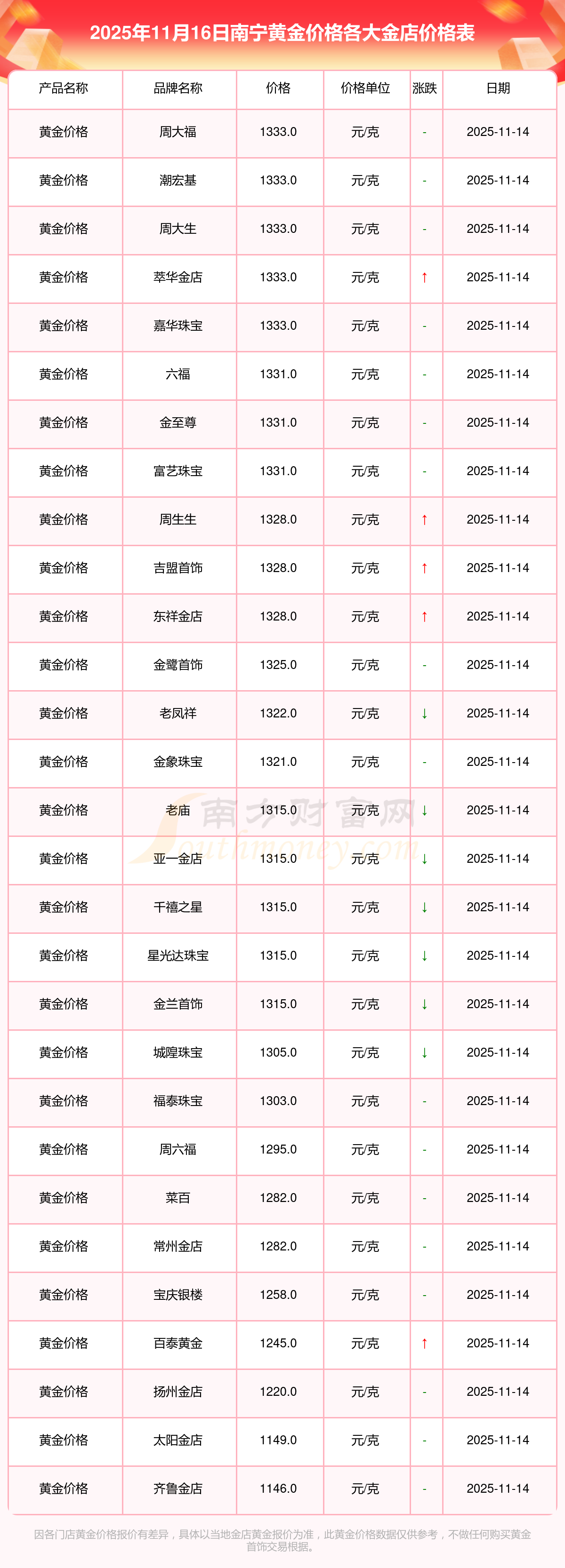 2025年11月16日南寧各大金店黃金價格最新價格:周大福1333.0元/克,周大福646.0元/克,周大福1333.0元/克,周大福46320.0,周大福18410.0,周大福41780.0,周大福1167.0元/克,老鳳祥1322.0元/克,老鳳祥600.0元/克,老鳳祥1322.0元/克,周六福1295.0元/克。