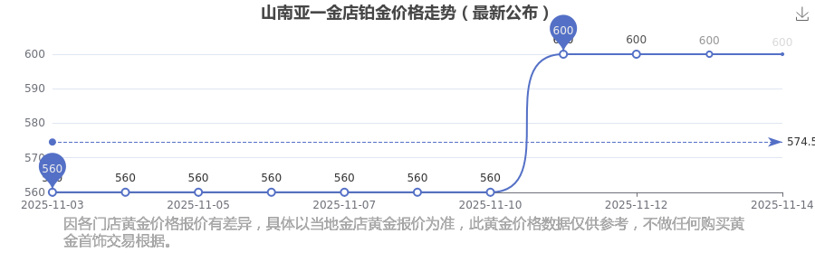 (2025年11月16日)今日山南亞一金店鉑金價(jià)格是600.0元/克。