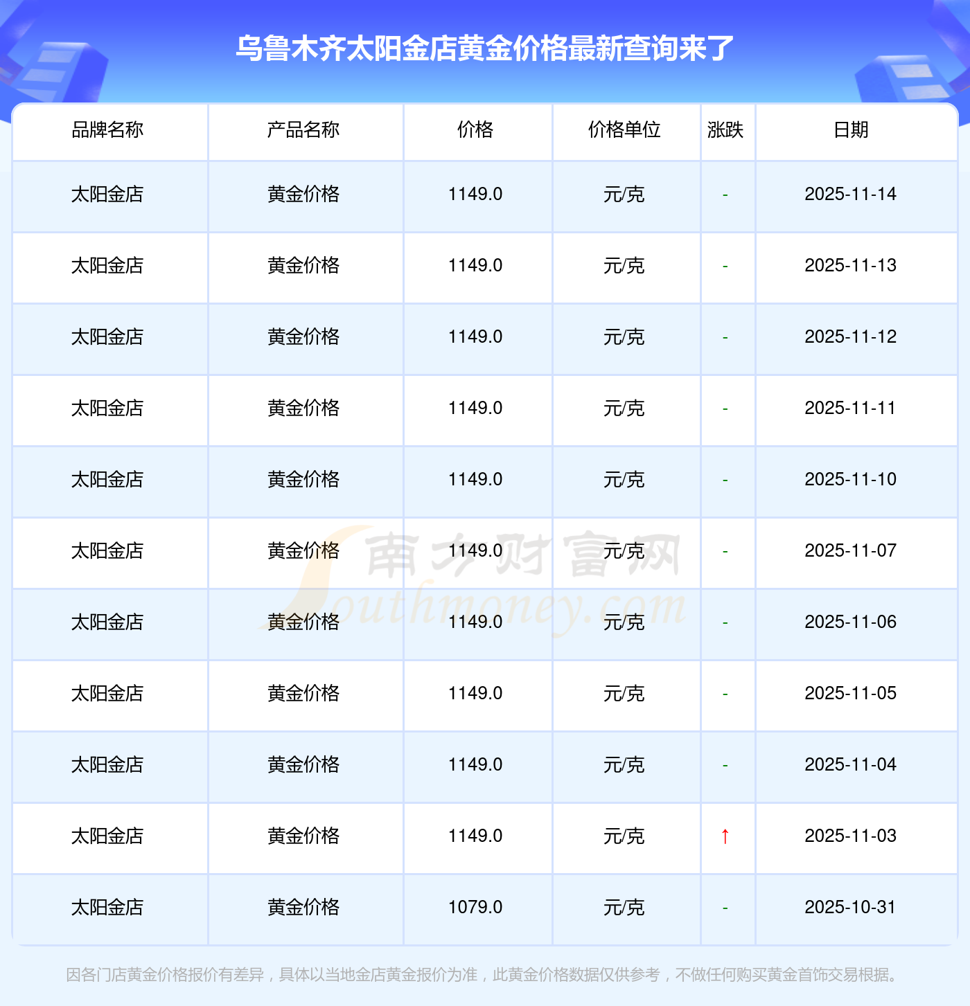 烏魯木齊太陽金店現(xiàn)在黃金價格每克多少?想了解今天黃金一克的行情價是多少錢?今日烏魯木齊太陽金店黃金價格查詢,1149.0元/克,這是烏魯木齊太陽金店于 2025年11月16日所定的黃金價格。