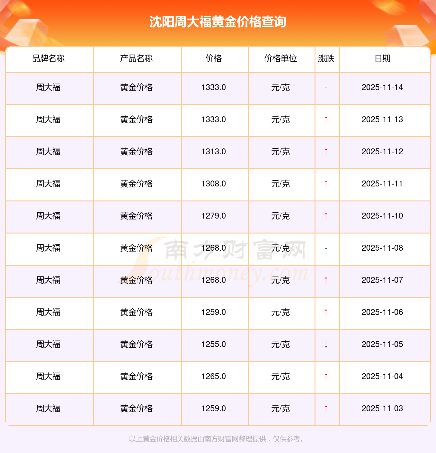 今日沈陽周大福黃金價(jià)格最新價(jià)格是1333.0元/克。