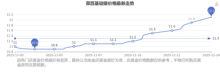 今日菜百 基礎(chǔ)銀價(jià)最新的市場(chǎng)標(biāo)價(jià)為12.1元/克。