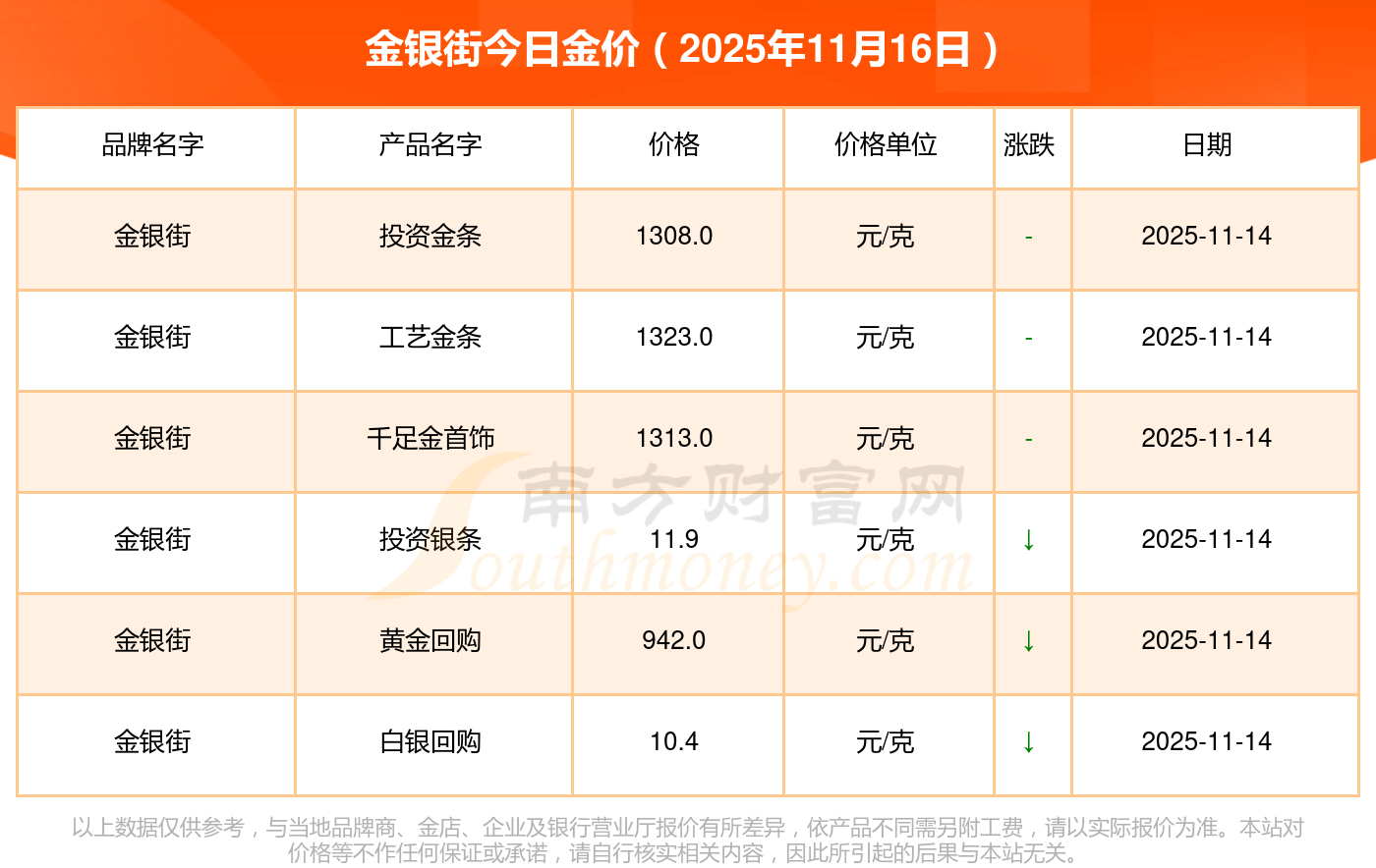 2025年11月16日金銀街今日價格:黃金價格1333.0元/克,鉑金價格646.0元/克,飾品金價(內(nèi)地)1333.0元/克,黃金飾品(香港)46320.0,鉑金價格(香港)18410.0,金條價格(香港)41780.0,金條金價(內(nèi)地)1167.0元/克,黃金價格1322.0元/克,鉑金價格600.0元/克,足金價格1322.0元/克,黃金價格1295.0元/克。