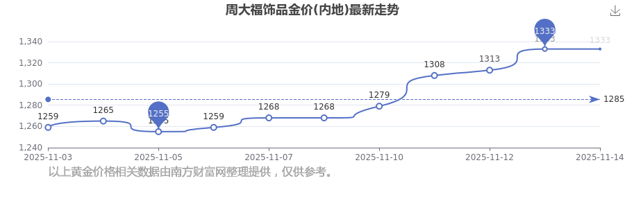周大福 飾品金價(內(nèi)地)在今日的最新價格顯示為1333.0元/克。