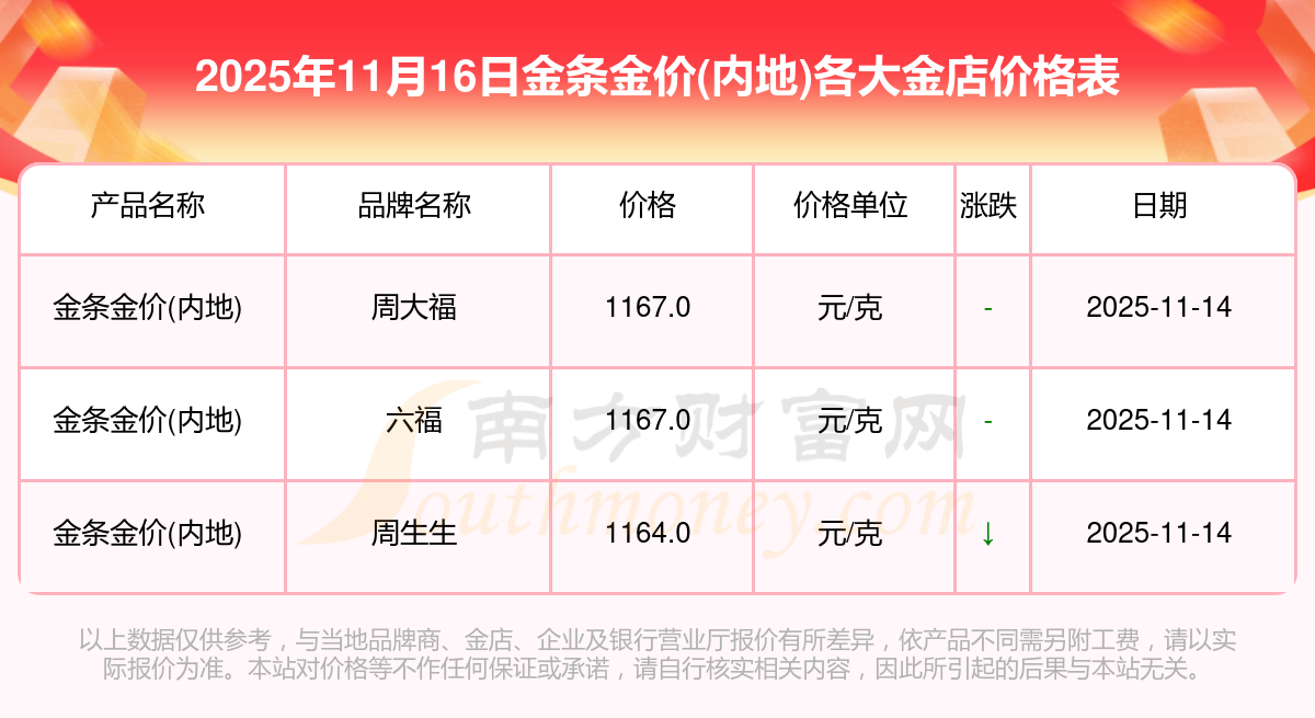2025年11月16日各大金店金條金價(內(nèi)地)最新價格:周大福1333.0元/克,周大福646.0元/克,周大福1333.0元/克,周大福46320.0,周大福18410.0,周大福41780.0,周大福1167.0元/克,老鳳祥1322.0元/克,老鳳祥600.0元/克,老鳳祥1322.0元/克,周六福1295.0元/克。
