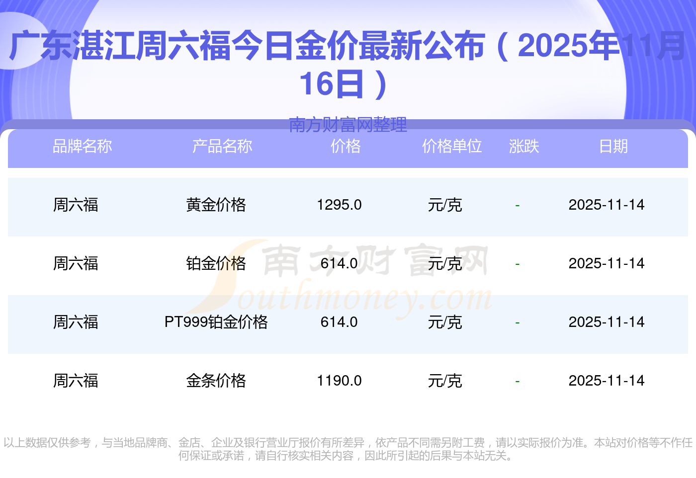 今日黃金售價(jià)是多少呢?此刻每克黃金價(jià)錢怎樣?2025年11月16日廣東湛江周六,F(xiàn)在黃金一克要多少錢:黃金價(jià)格1333.0元/克,鉑金價(jià)格646.0元/克,飾品金價(jià)(內(nèi)地)1333.0元/克,黃金飾品(香港)46320.0,鉑金價(jià)格(香港)18410.0,金條價(jià)格(香港)41780.0,金條金價(jià)(內(nèi)地)1167.0元/克,黃金價(jià)格1322.0元/克,鉑金價(jià)格600.0元/克,足金價(jià)格1322.0元/克,黃金價(jià)格1295.0元/克。