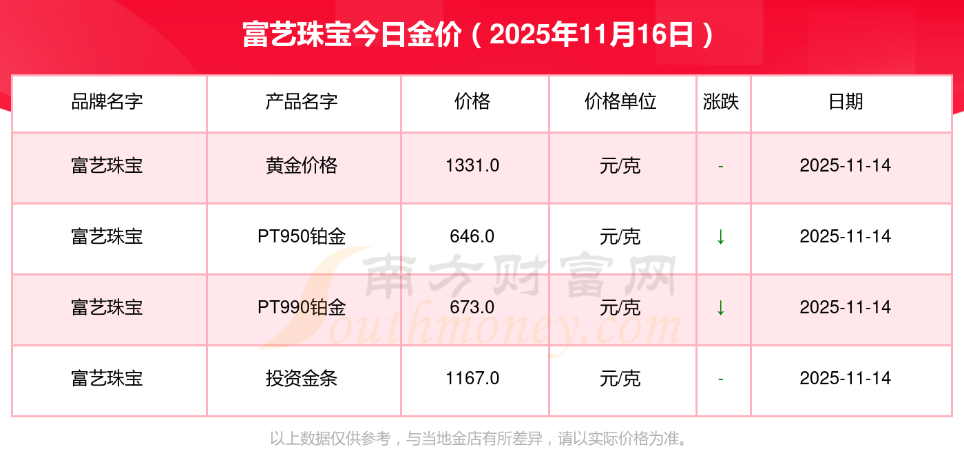 2025年11月16日,周大福、周大福、周大福、周大福、周大福、周大福、周大福、老鳳祥、老鳳祥、老鳳祥、周六福等各大金店品牌黃金價格今日價格如下:周大福1333.0元/克、周大福646.0元/克、周大福1333.0元/克、周大福46320.0、周大福18410.0、周大福41780.0、周大福1167.0元/克、老鳳祥1322.0元/克、老鳳祥600.0元/克、老鳳祥1322.0元/克、周六福1295.0元/克。