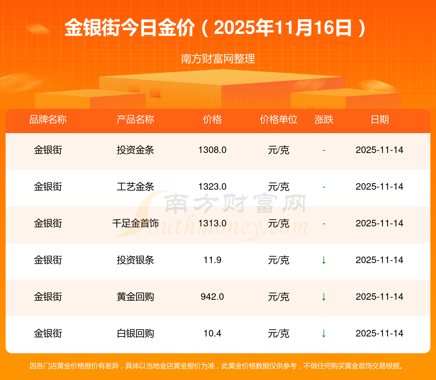 2025年11月16日金銀街金價(jià)查詢:黃金價(jià)格1333.0元/克,鉑金價(jià)格646.0元/克,飾品金價(jià)(內(nèi)地)1333.0元/克,黃金飾品(香港)46320.0,鉑金價(jià)格(香港)18410.0,金條價(jià)格(香港)41780.0,金條金價(jià)(內(nèi)地)1167.0元/克,黃金價(jià)格1322.0元/克,鉑金價(jià)格600.0元/克,足金價(jià)格1322.0元/克,黃金價(jià)格1295.0元/克。