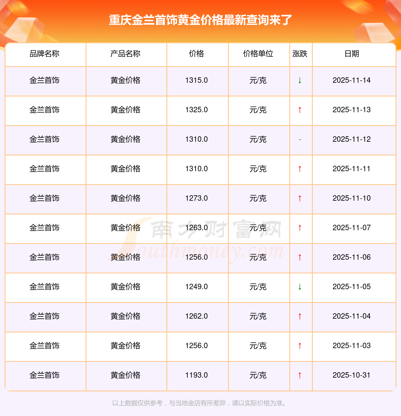 今日(2025年11月16日),重慶金蘭首飾黃金價(jià)格:1315.0元/克。