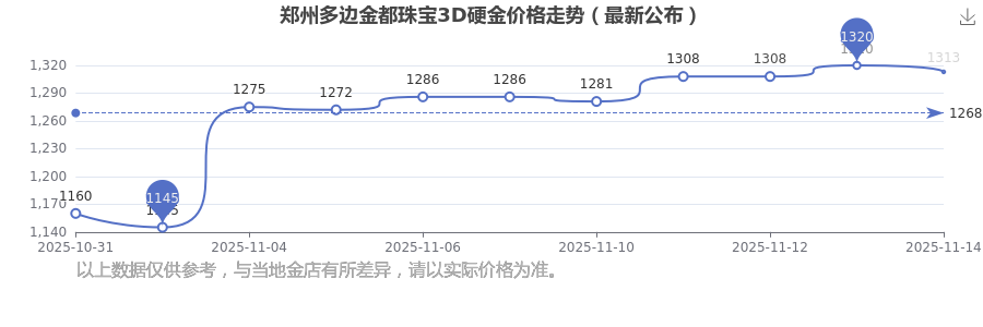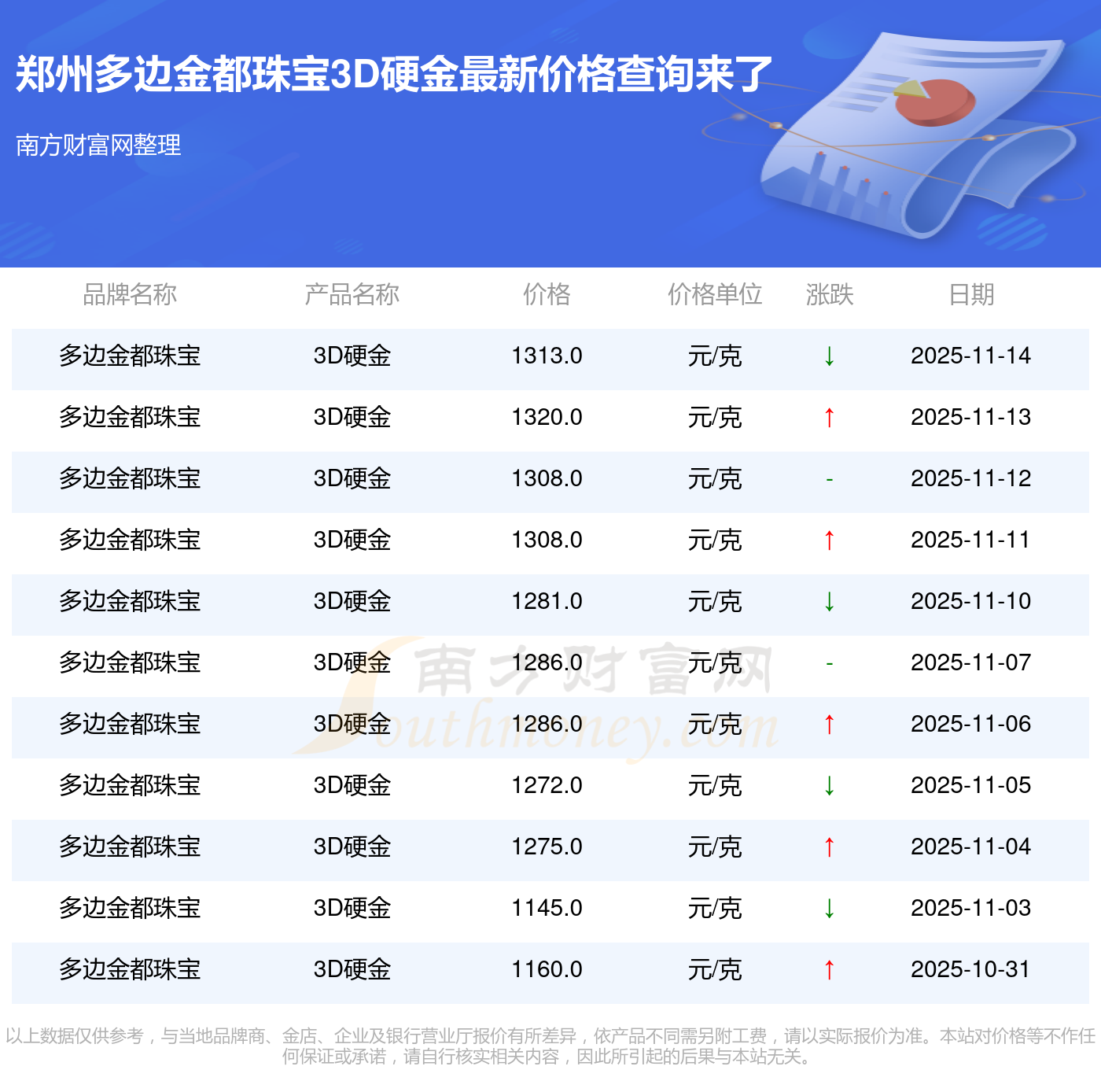 鄭州多邊金都珠寶在 2025年11月16日,3D硬金的售賣(mài)價(jià)格是 1313.0元/克。