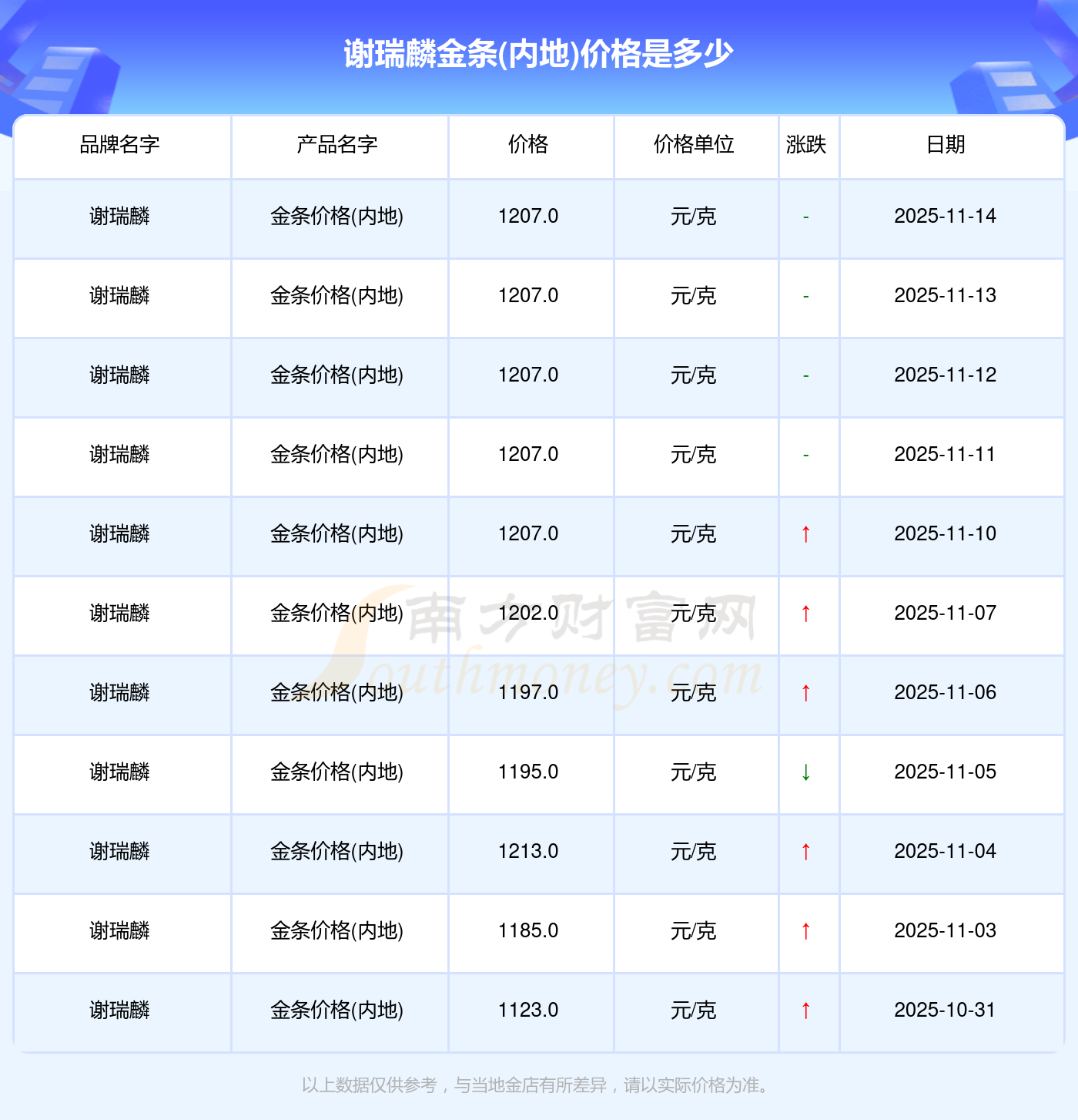 謝瑞麟 金條價(jià)格(內(nèi)地)今日最新的價(jià)位是1207.0元/克。