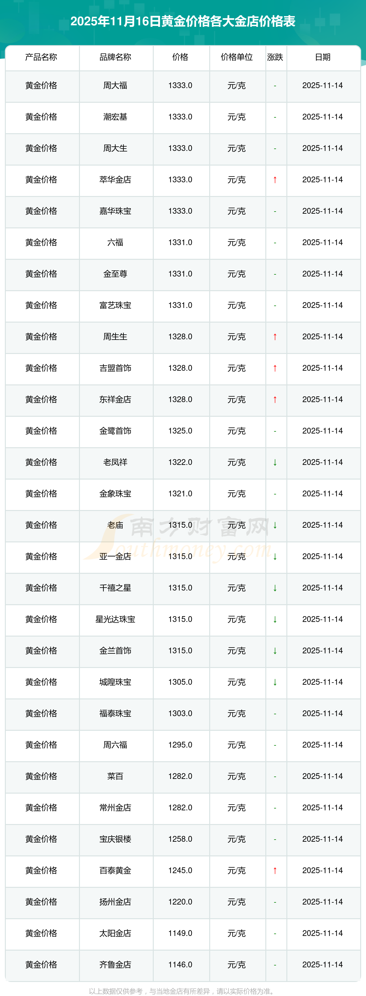 2025年11月16日,周大福、周大福、周大福、周大福、周大福、周大福、周大福、老鳳祥、老鳳祥、老鳳祥、周六福等各大金店品牌黃金價格今日價格如下:周大福1333.0元/克、周大福646.0元/克、周大福1333.0元/克、周大福46320.0、周大福18410.0、周大福41780.0、周大福1167.0元/克、老鳳祥1322.0元/克、老鳳祥600.0元/克、老鳳祥1322.0元/克、周六福1295.0元/克。