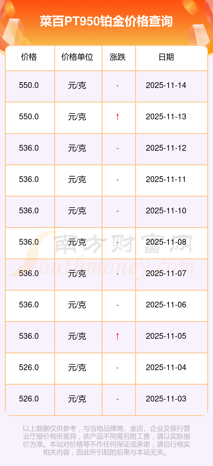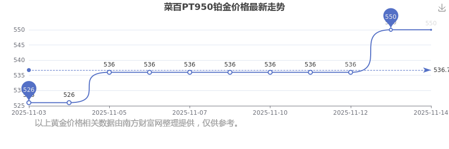 今日菜百PT950鉑金價(jià)格:550.0元/克。