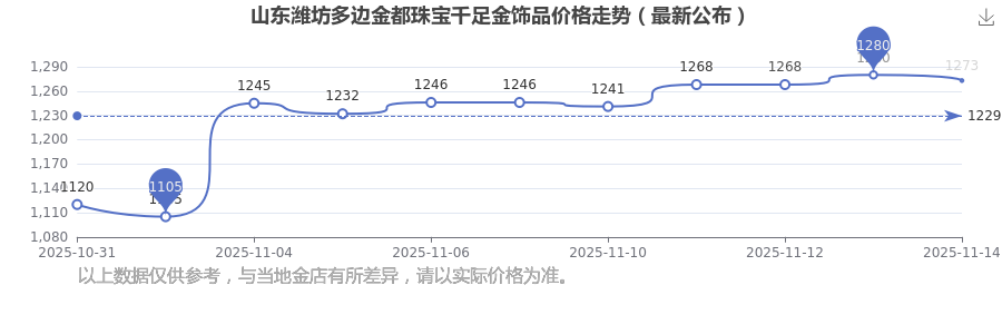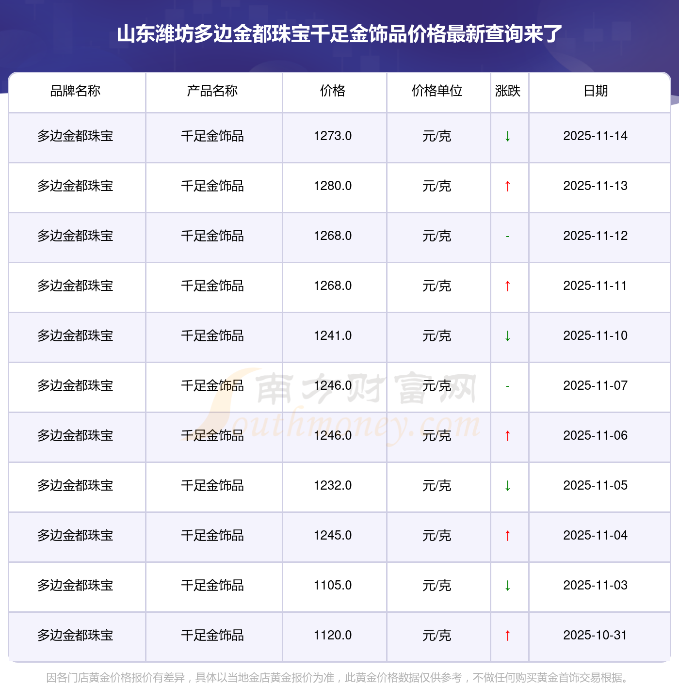 今日(2025年11月16日)山東濰坊多邊金都珠寶千足金飾品價(jià)格為1273.0元/克。