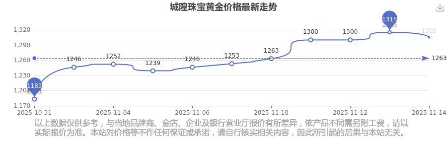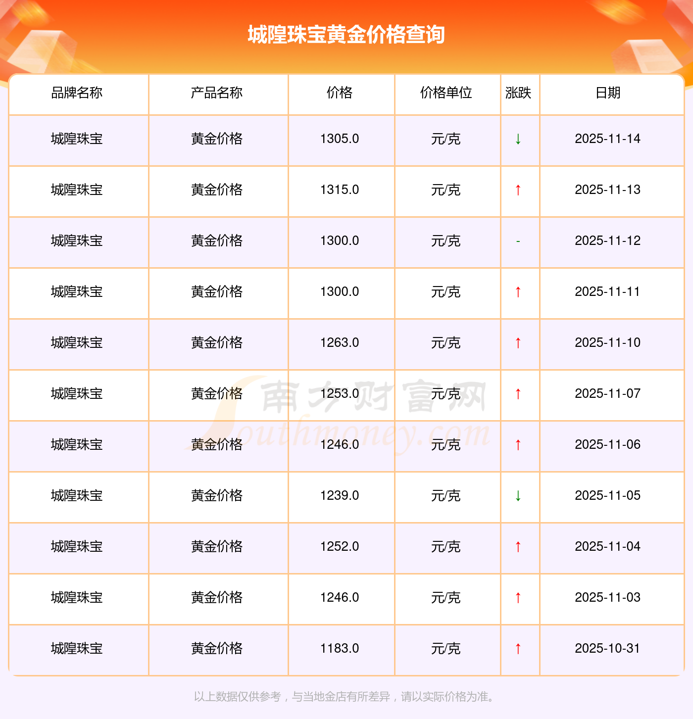 今日(2025年11月16日)城隍珠寶黃金價格是1305.0元/克。