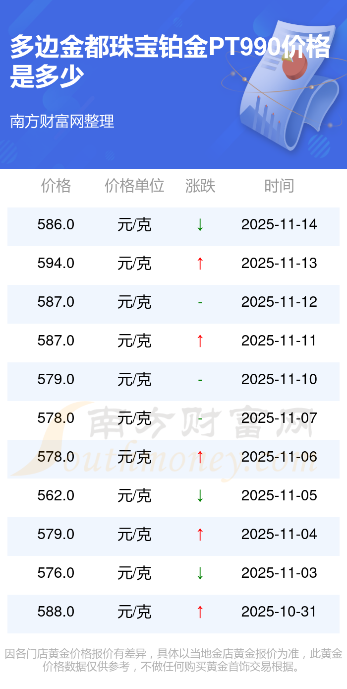 今日多邊金都珠寶鉑金PT990價(jià)格最新查詢:586.0元/克。