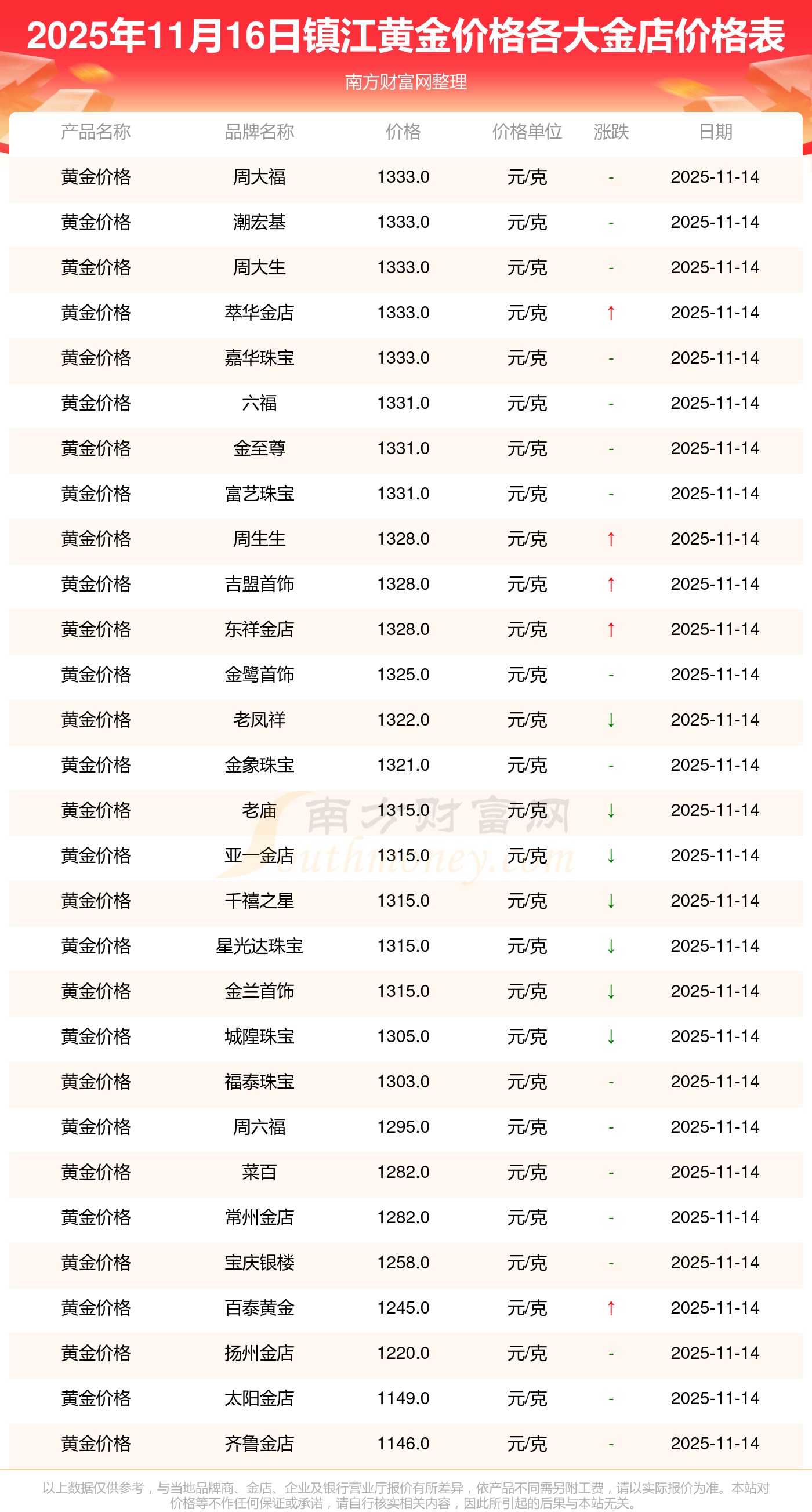 今天是2025年11月16日,鎮(zhèn)江周大福、周大福、周大福、周大福、周大福、周大福、周大福、老鳳祥、老鳳祥、老鳳祥、周六福等各大金店品牌黃金價(jià)格最新價(jià)格行情是這樣的:周大福1333.0元/克、周大福646.0元/克、周大福1333.0元/克、周大福46320.0、周大福18410.0、周大福41780.0、周大福1167.0元/克、老鳳祥1322.0元/克、老鳳祥600.0元/克、老鳳祥1322.0元/克、周六福1295.0元/克。