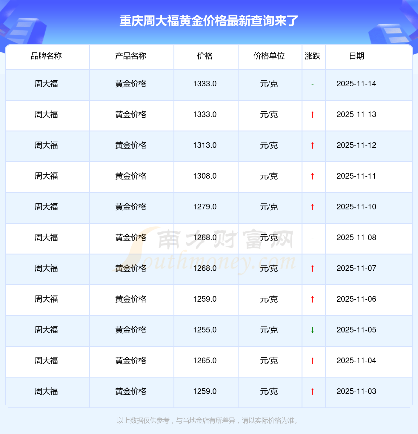 重慶周大,F(xiàn)在黃金價格每克多少?現(xiàn)在買一克黃金得花多少錢?今日重慶周大福黃金價格查詢,(2025年11月16日)重慶周大福黃金價格現(xiàn)在為1333.0元/克。
