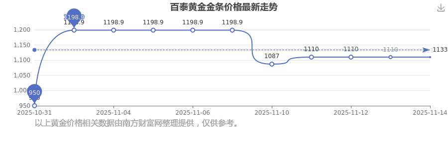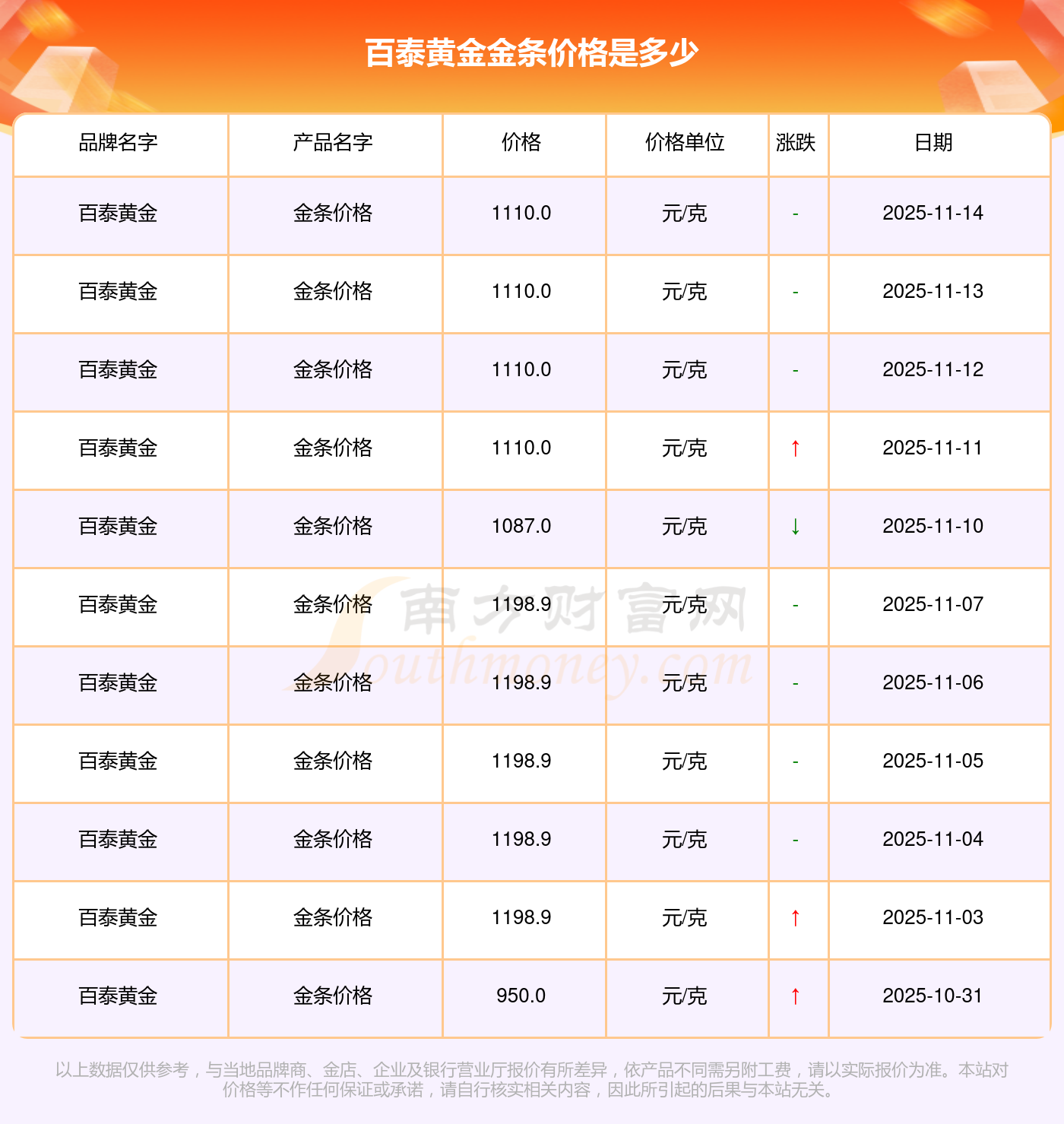 今日百泰黃金金條價(jià)格最新查詢:1110.0元/克。