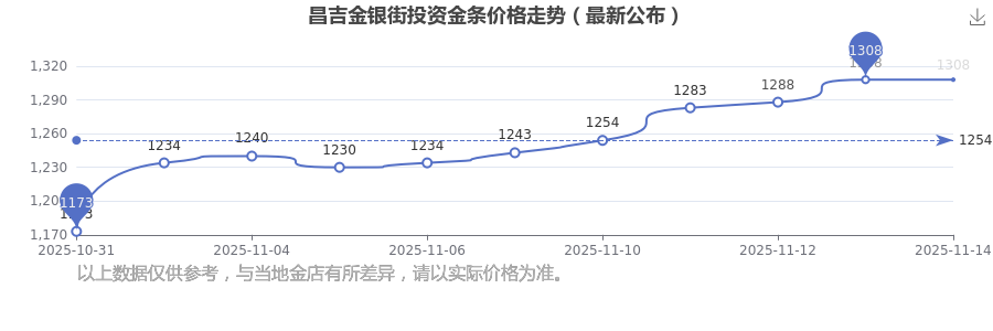 今日昌吉金銀街投資金條價格是1308.0元/克。