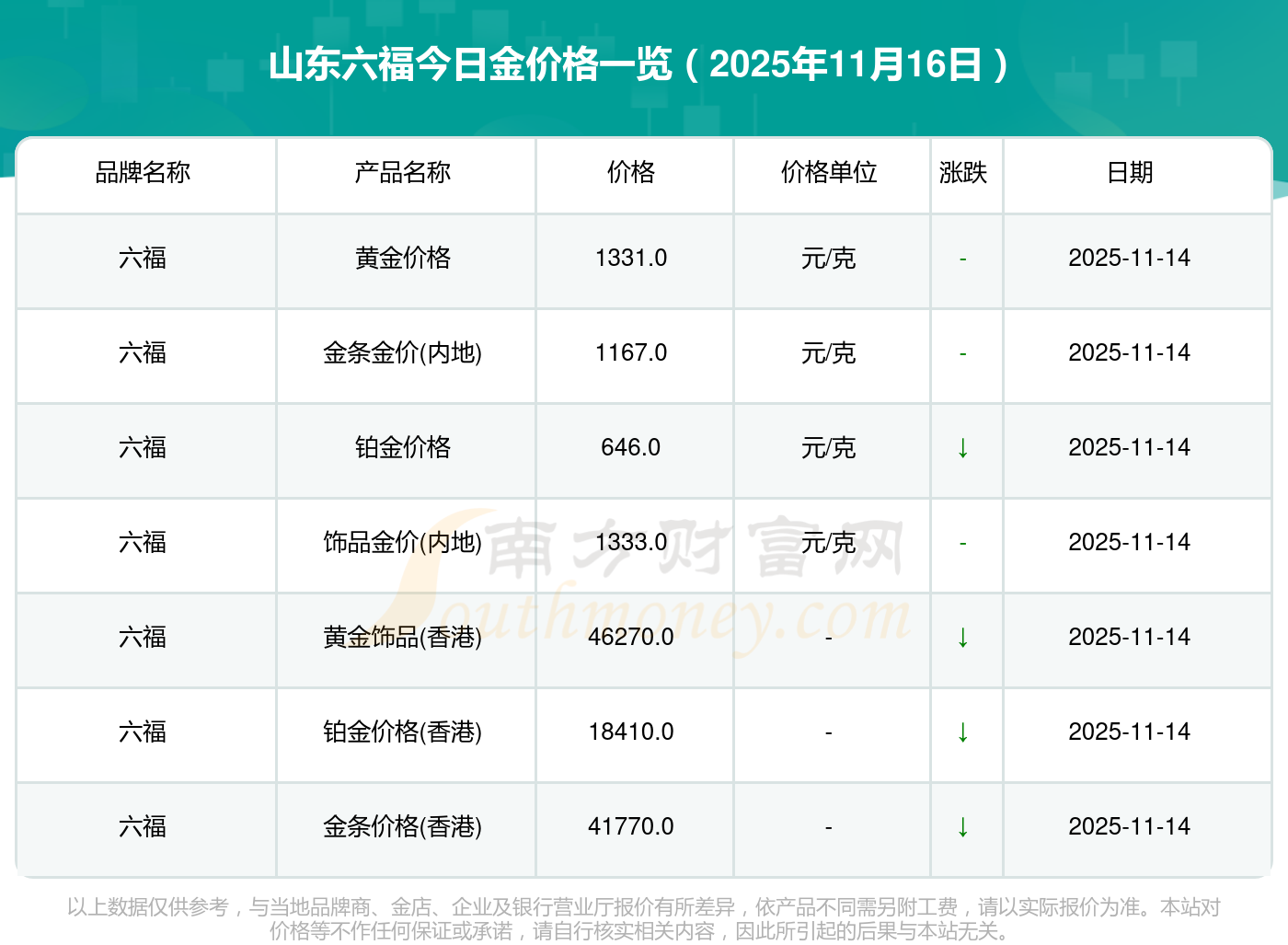 2025年11月16日山東六福金價查詢:黃金價格1333.0元/克,鉑金價格646.0元/克,飾品金價(內(nèi)地)1333.0元/克,黃金飾品(香港)46320.0,鉑金價格(香港)18410.0,金條價格(香港)41780.0,金條金價(內(nèi)地)1167.0元/克,黃金價格1322.0元/克,鉑金價格600.0元/克,足金價格1322.0元/克,黃金價格1295.0元/克。