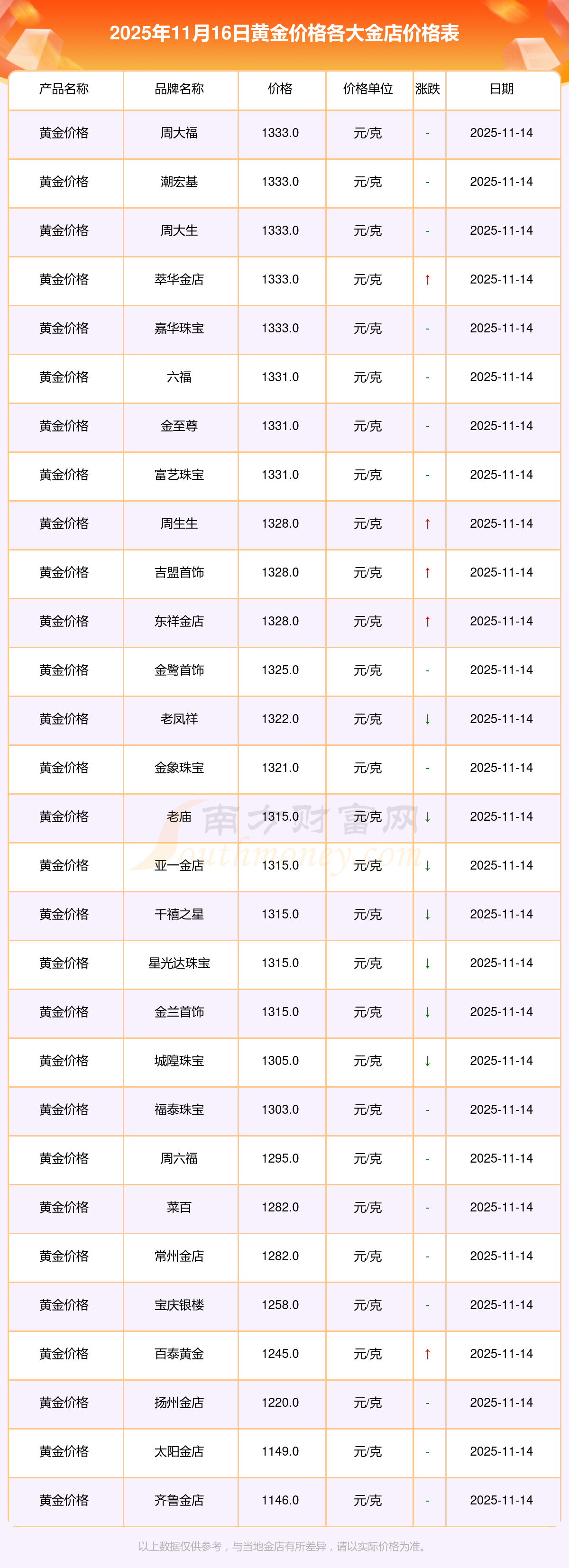 2025年11月16日周大福、周大福、周大福、周大福、周大福、周大福、周大福、老鳳祥、老鳳祥、老鳳祥、周六福等各大金店品牌黃金價(jià)格最新價(jià)格如下:周大福黃金價(jià)格1333.0元/克,周大福鉑金價(jià)格646.0元/克,周大福飾品金價(jià)(內(nèi)地)1333.0元/克,周大福黃金飾品(香港)46320.0,周大福鉑金價(jià)格(香港)18410.0,周大福金條價(jià)格(香港)41780.0,周大福金條金價(jià)(內(nèi)地)1167.0元/克,老鳳祥黃金價(jià)格1322.0元/克,老鳳祥鉑金價(jià)格600.0元/克,老鳳祥足金價(jià)格1322.0元/克,周六福黃金價(jià)格1295.0元/克。