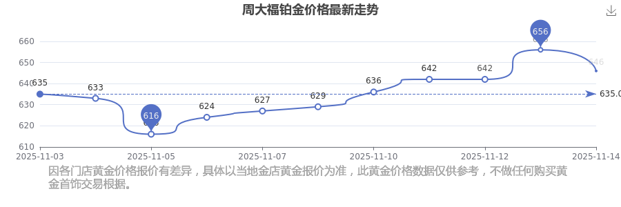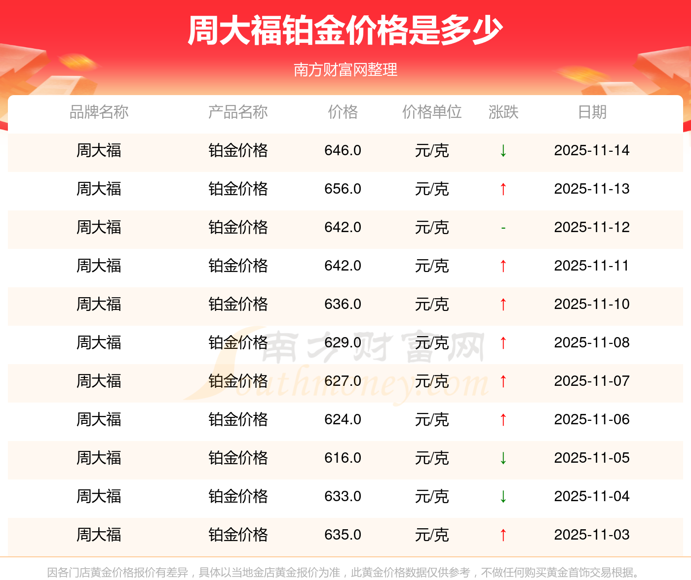 目前周大福 鉑金價格的價格,今日最新為646.0元/克。